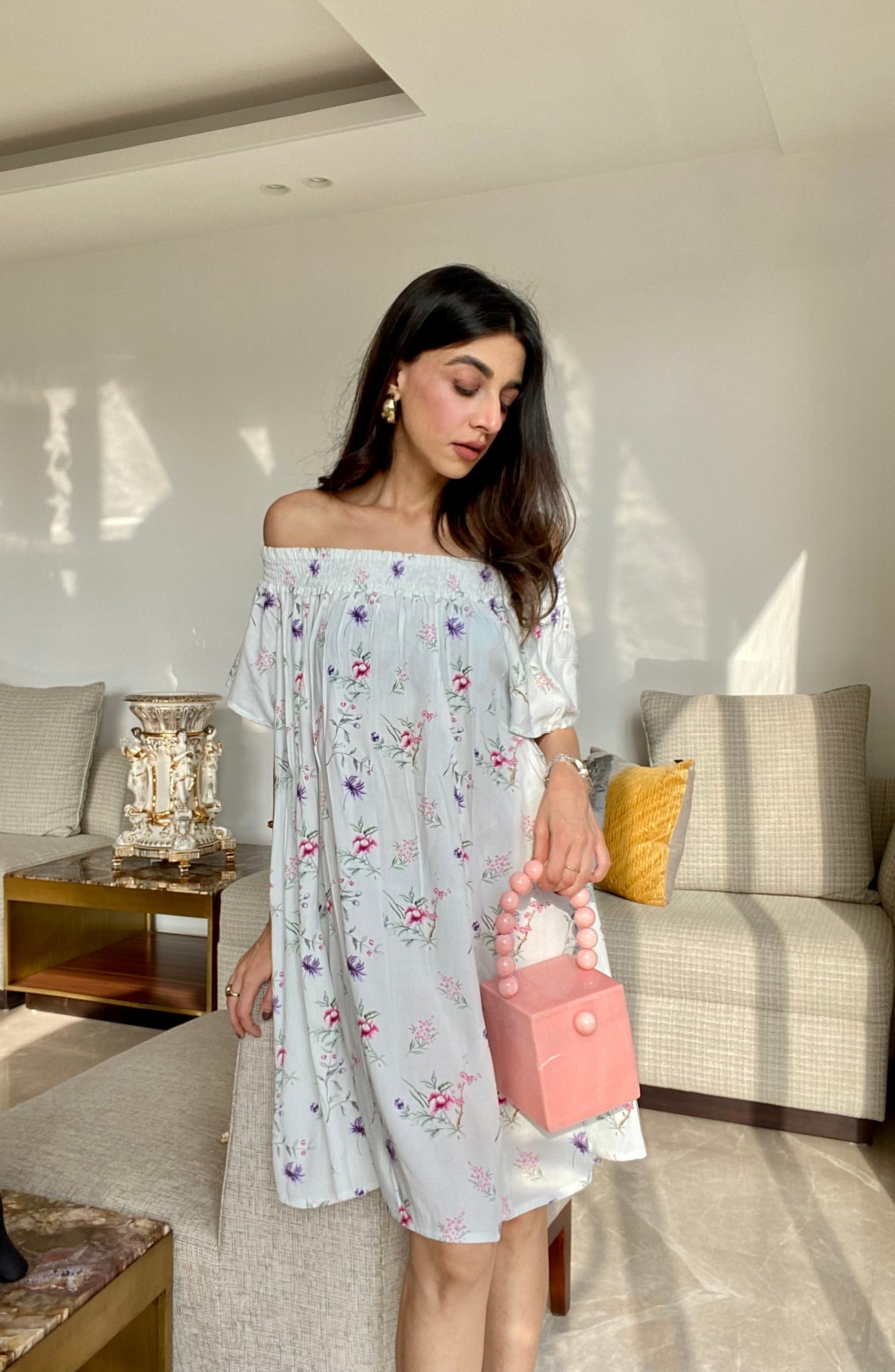 We never met a mini dress we didn't like and the Calla (blue) mini dress is no different! Adorned in delicate, intricate smocking on the shoulders, with a very light sky blue print, this tube dress is comfort chic at it's best.