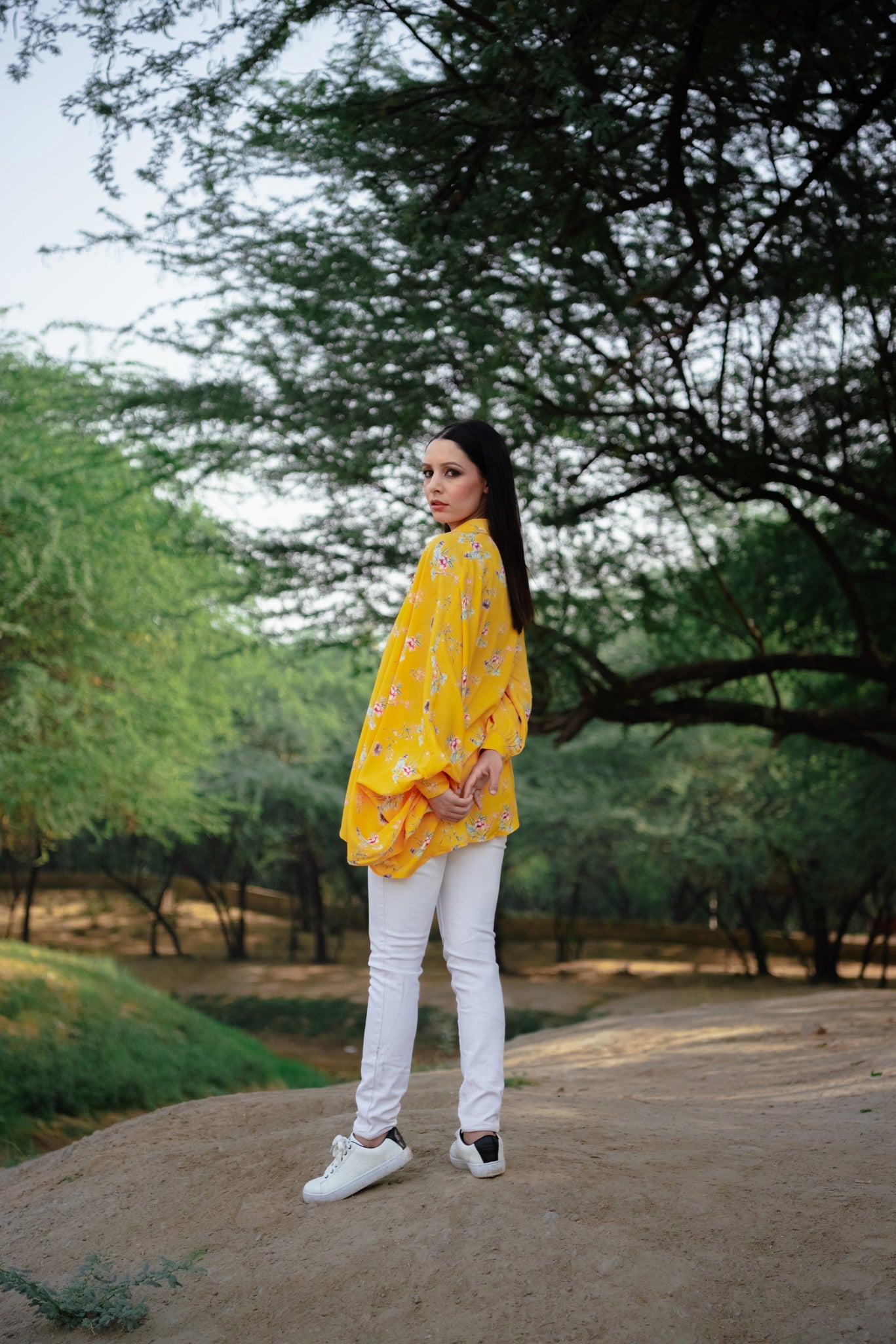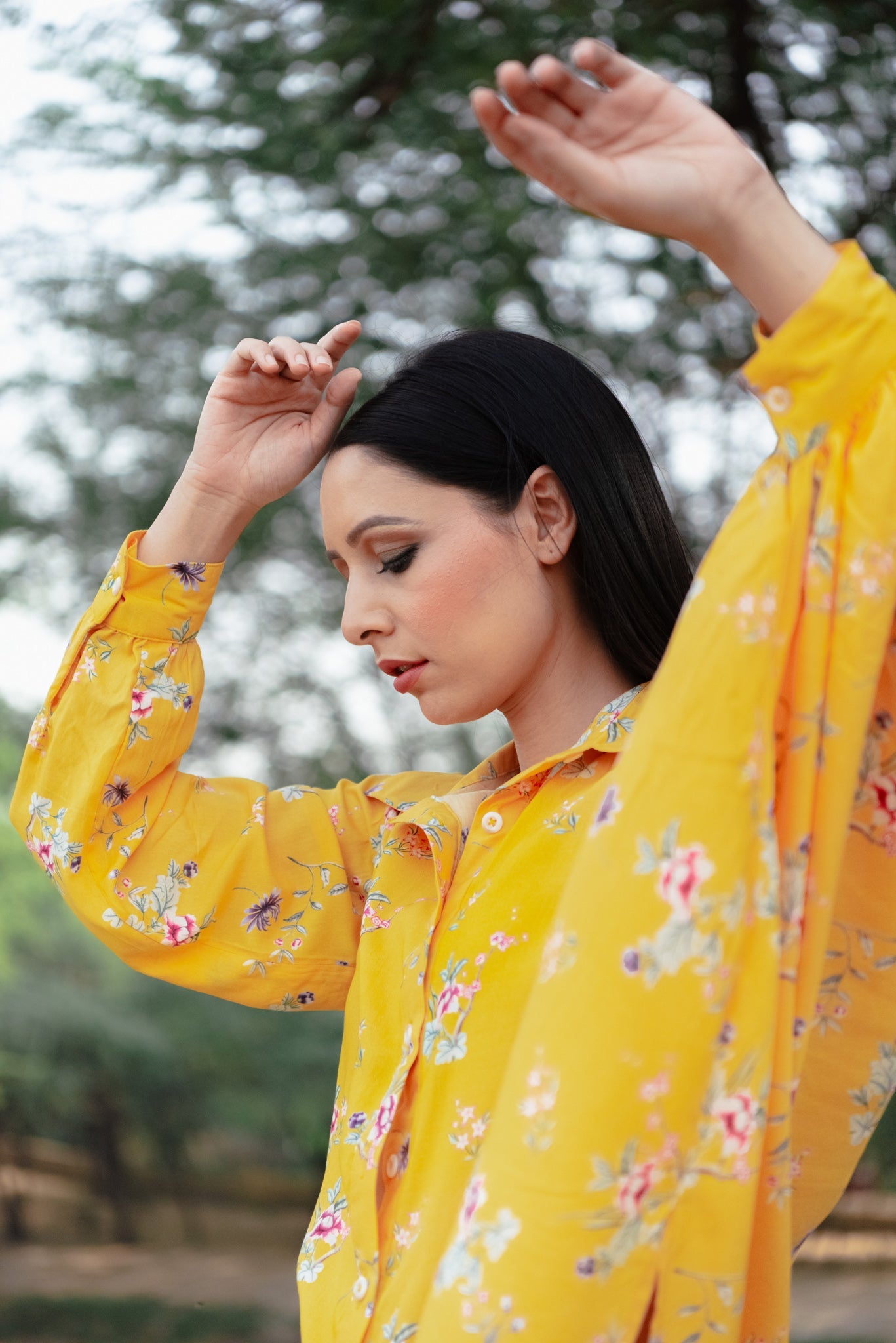 As sweet as a chilled shot of limoncello, the Calla (yellow) Asymmetrical shirt is a burst of bright energy you're sure to love. With handpaint printed print of flowers along the frill and a chinese collar neckband; watch the sparks fly in this shirt.
