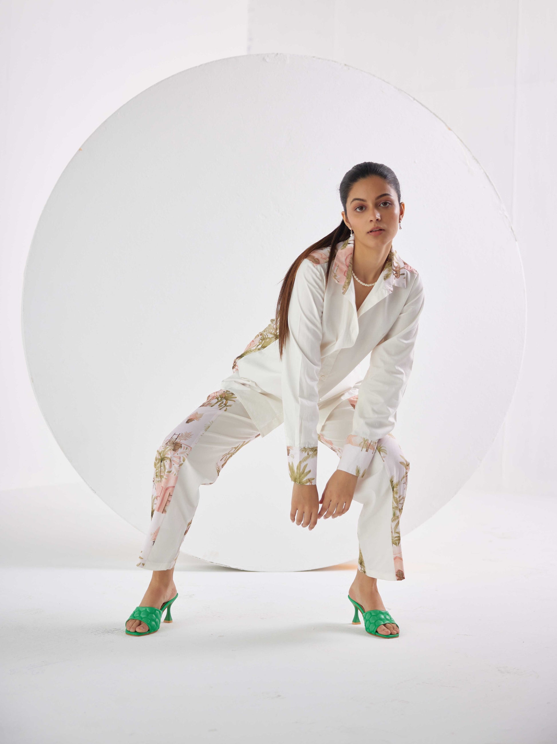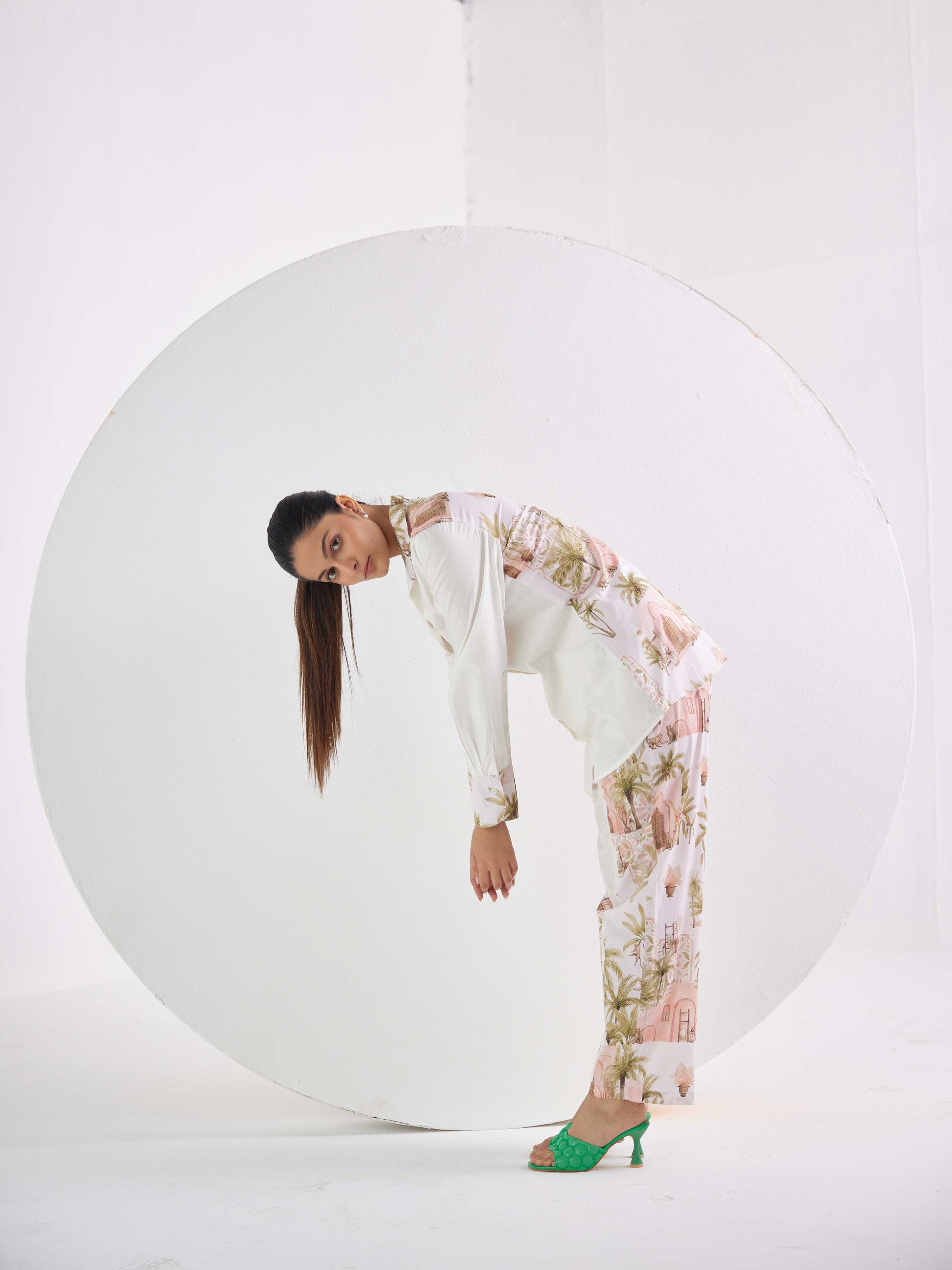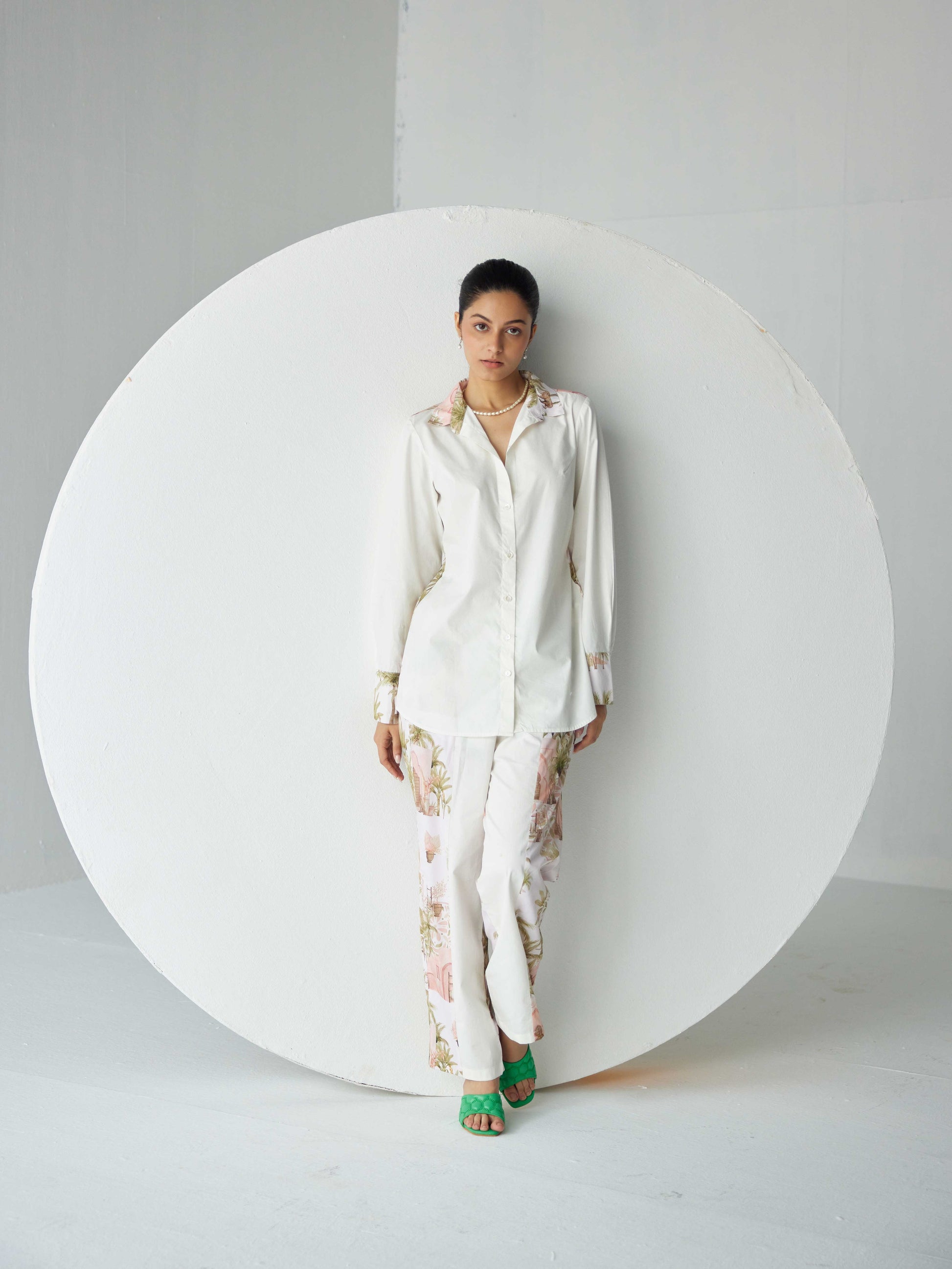 This RELAXED FIT VISCOS CREPE and POPLIN CO-RD SET is designed to stand out. The shirt has a unique historical door view print, with highlights on the cuffs and collar and back. The pants have print detailing and poplin, elevating the look. Create a timeless ensemble with this captivating set.