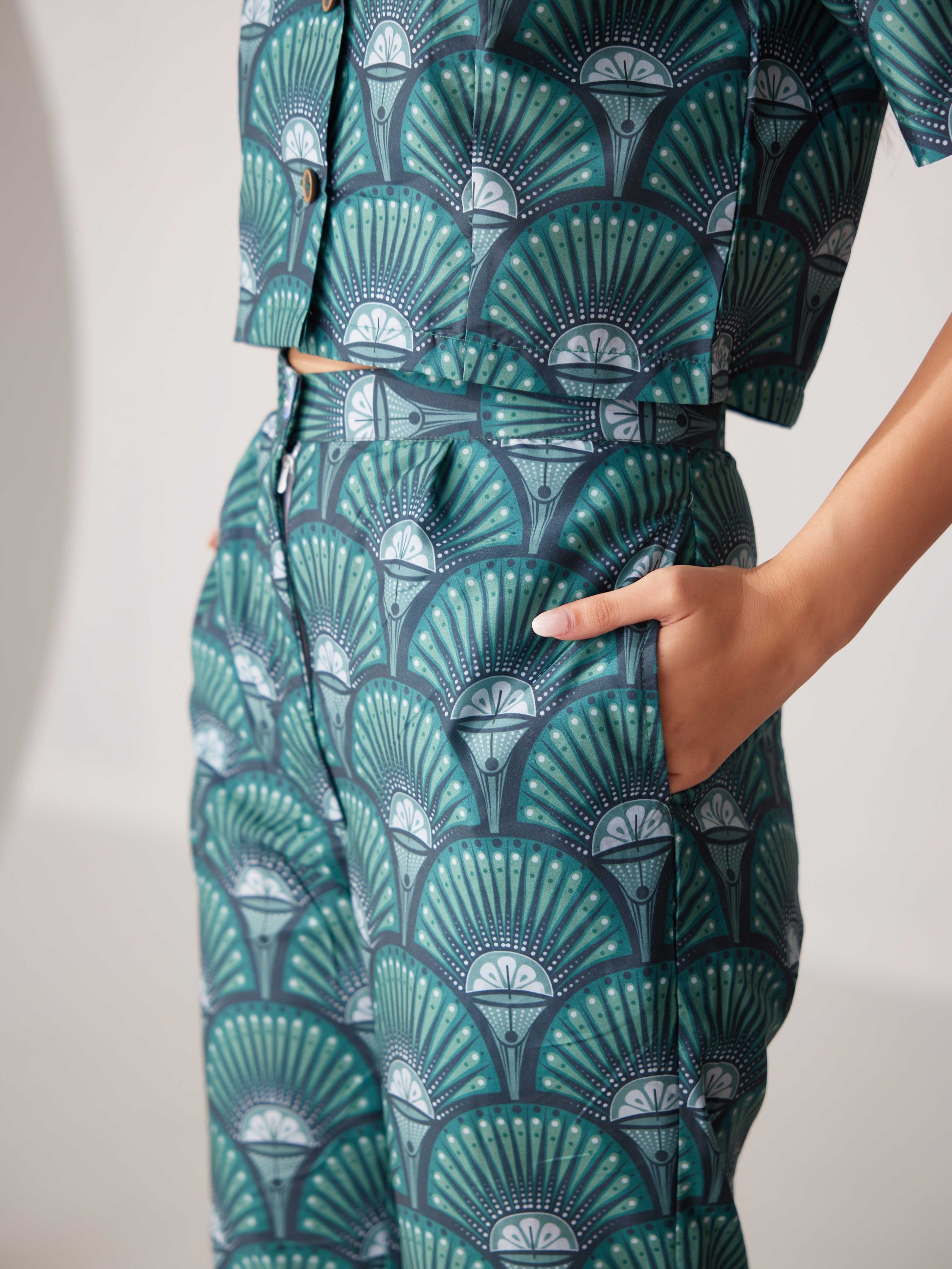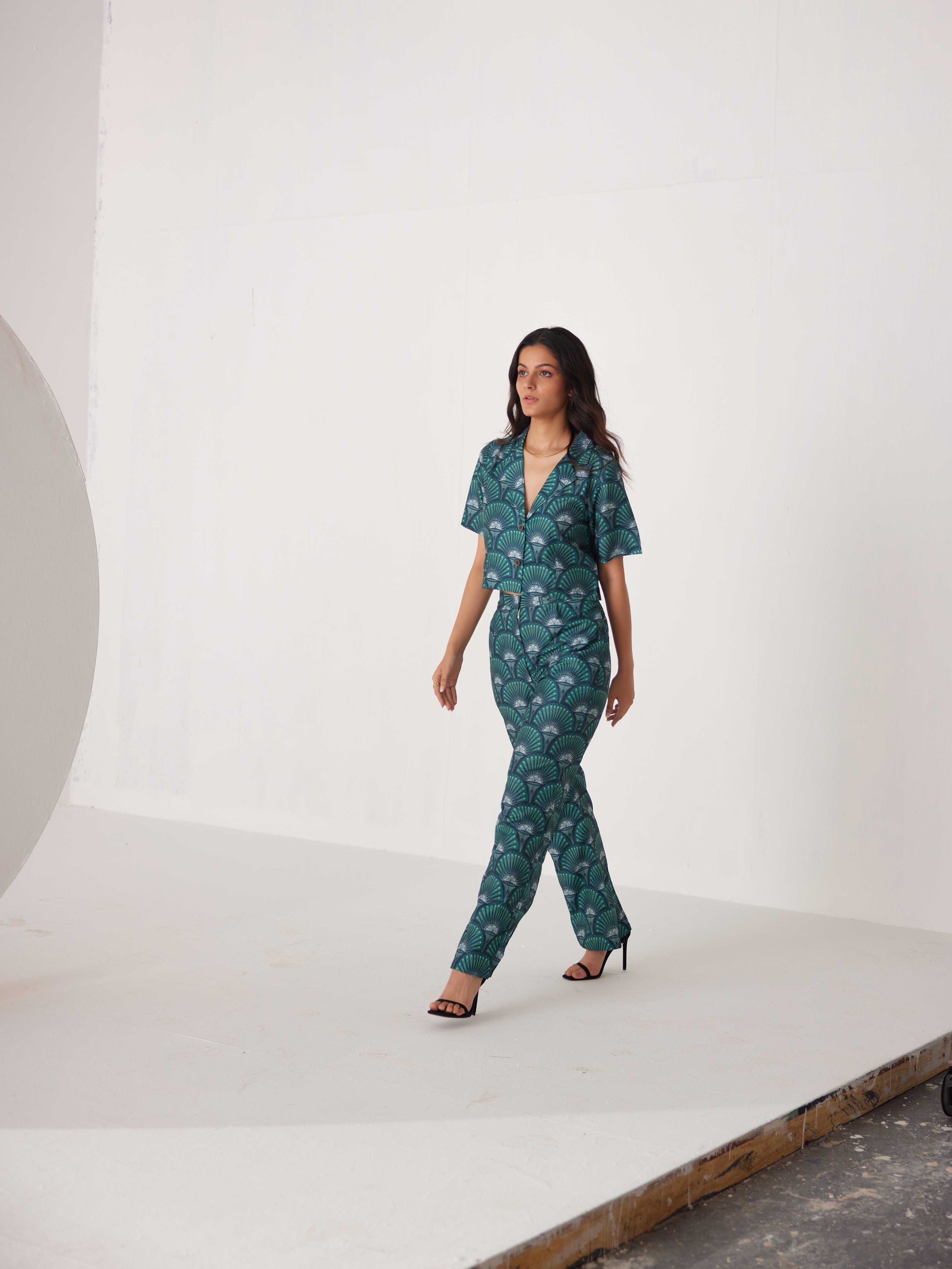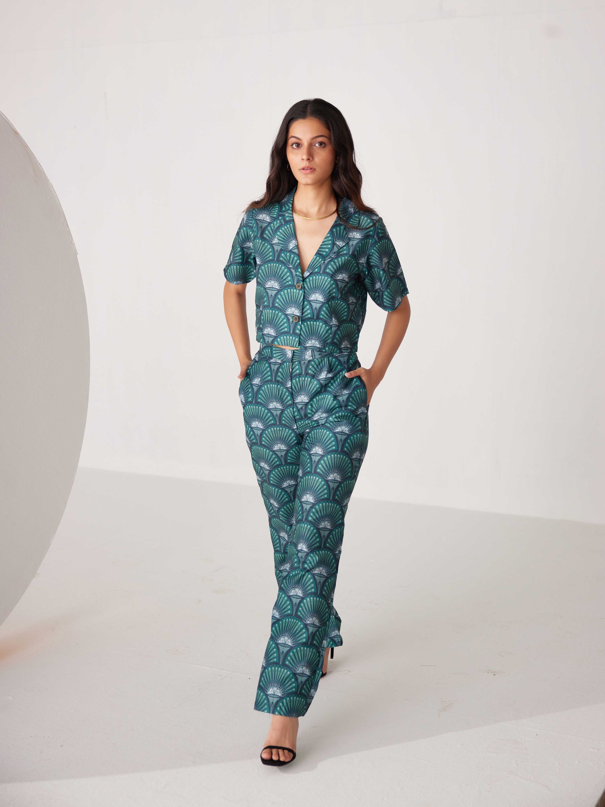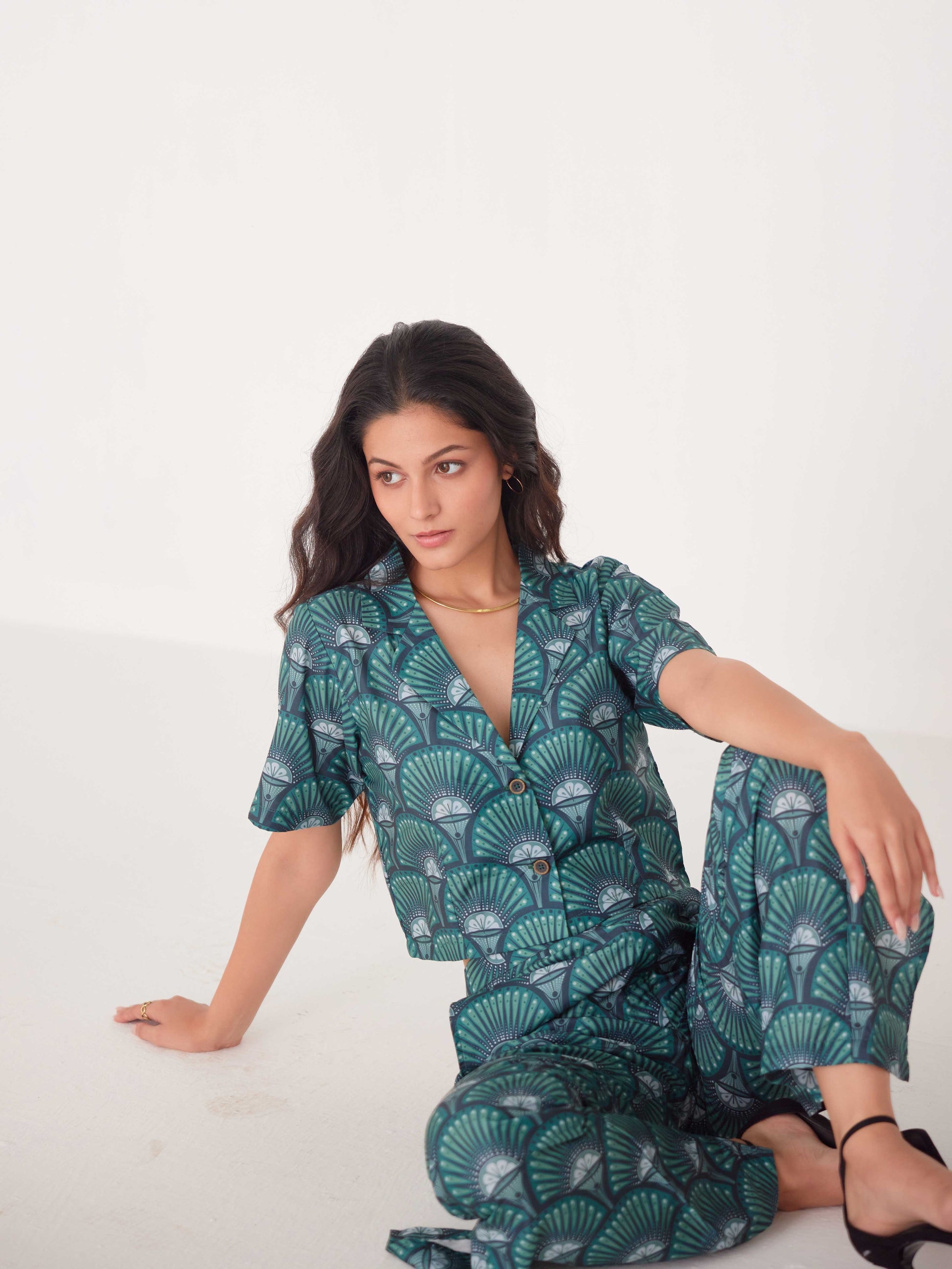 Unleash modern elegance with our RELAXED FIT Viscose Crepe ensemble, a contemporary twist on a classic style. The deep hue of the co-ord set perfectly complements the forest fern crop top, with elbow sleeves and a chic coat collar. The ensemble is completed by pants in a delicate, muted print, ensuring a timeless yet stylish appearance.