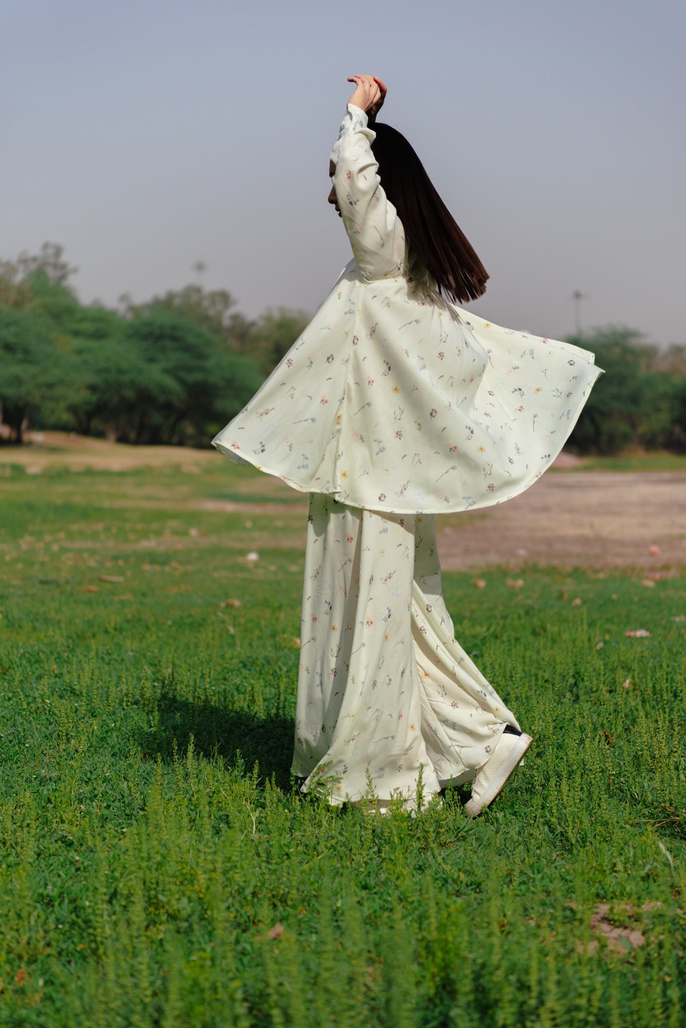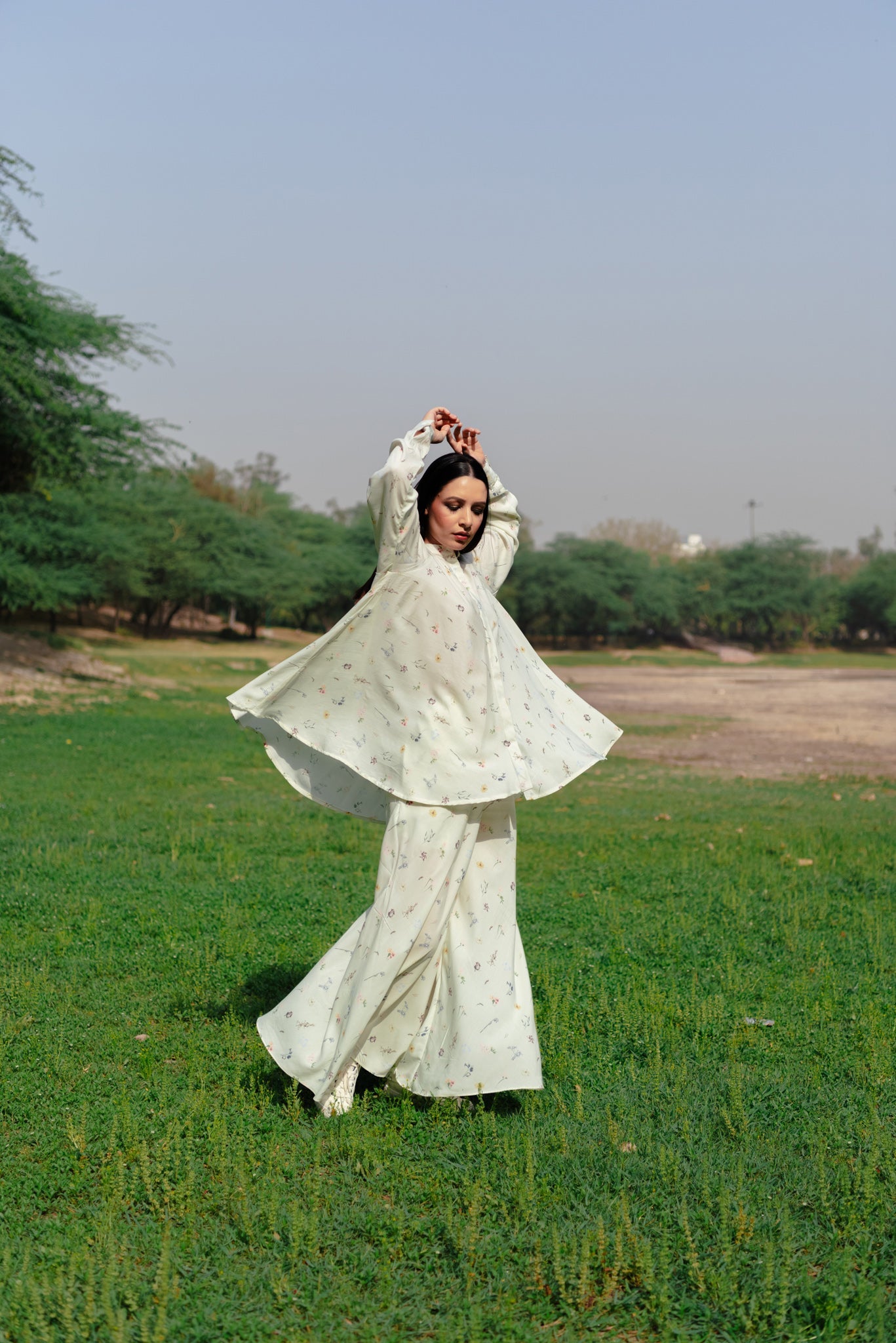 This top will have you dreaming of sunny skies and blue waters! The handpainted print adds a romantic touch while the subtle, elegant colour is a pure delight. It looks fabulous when paired with the co-ord palazzo pants.