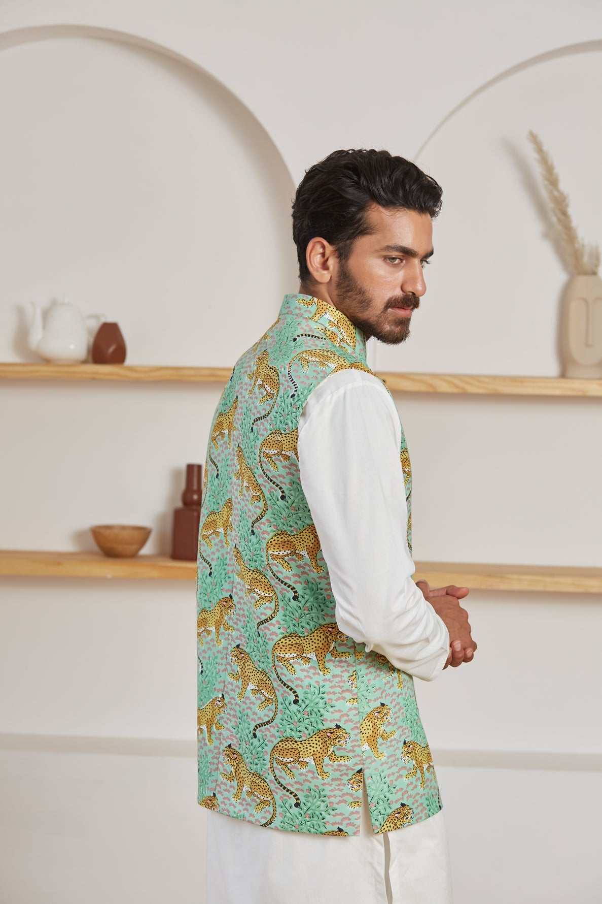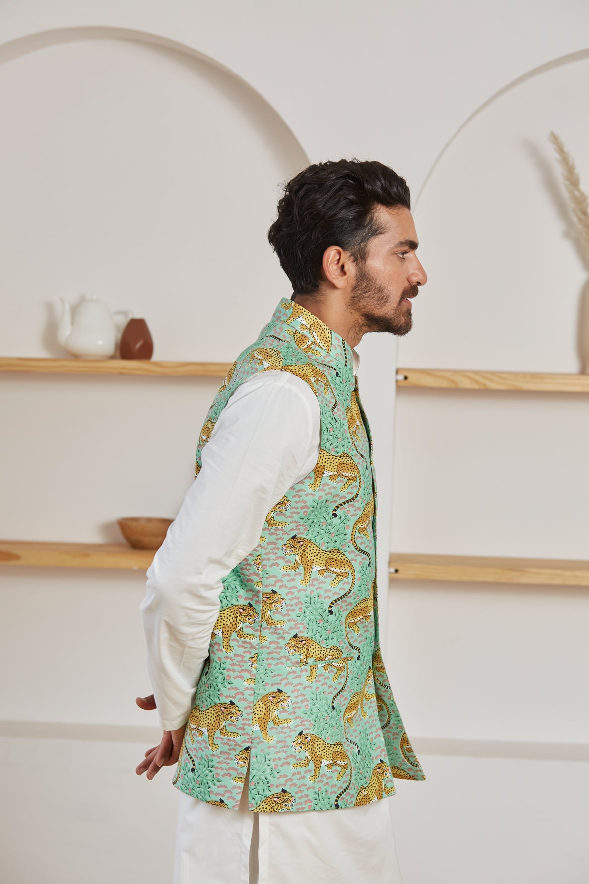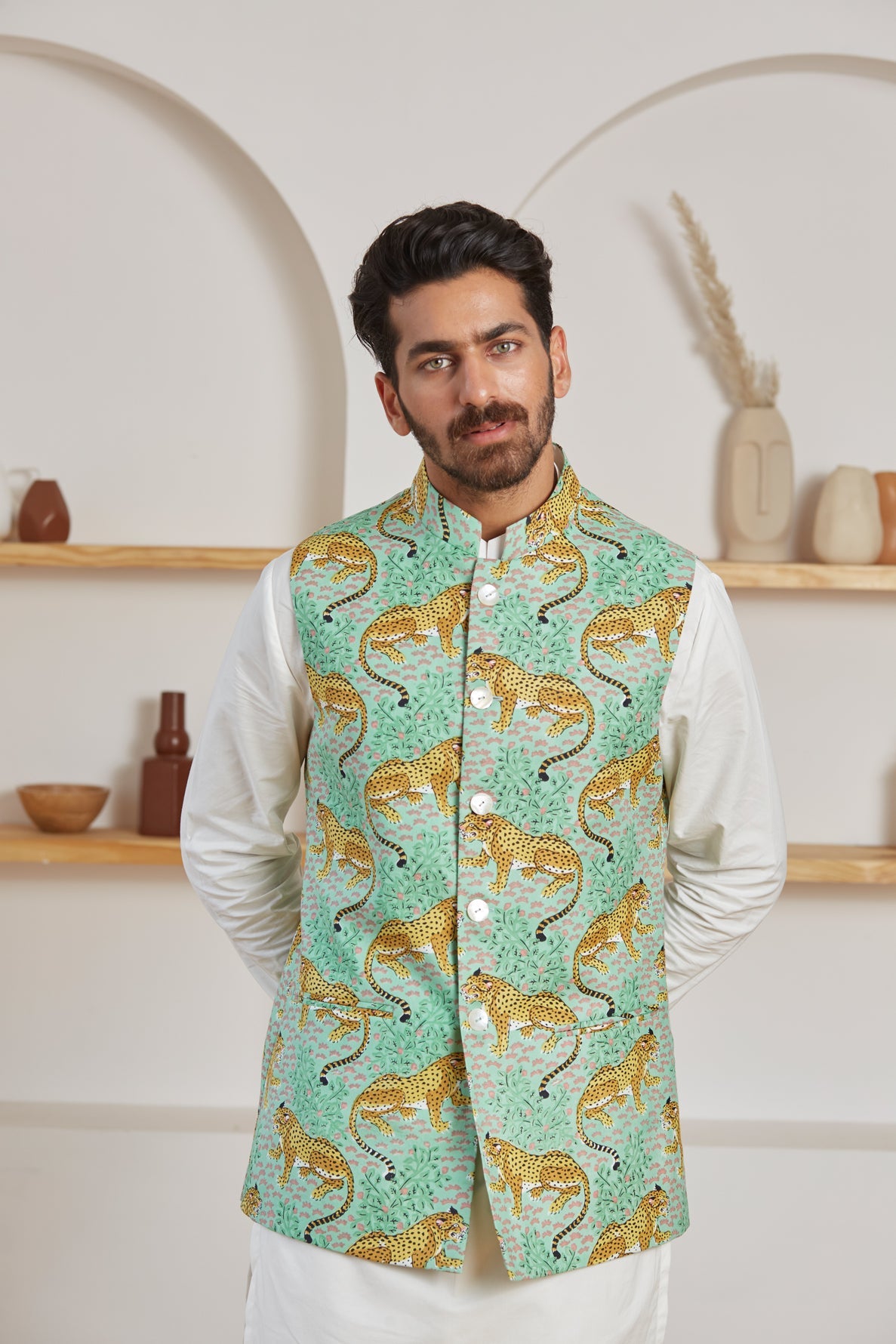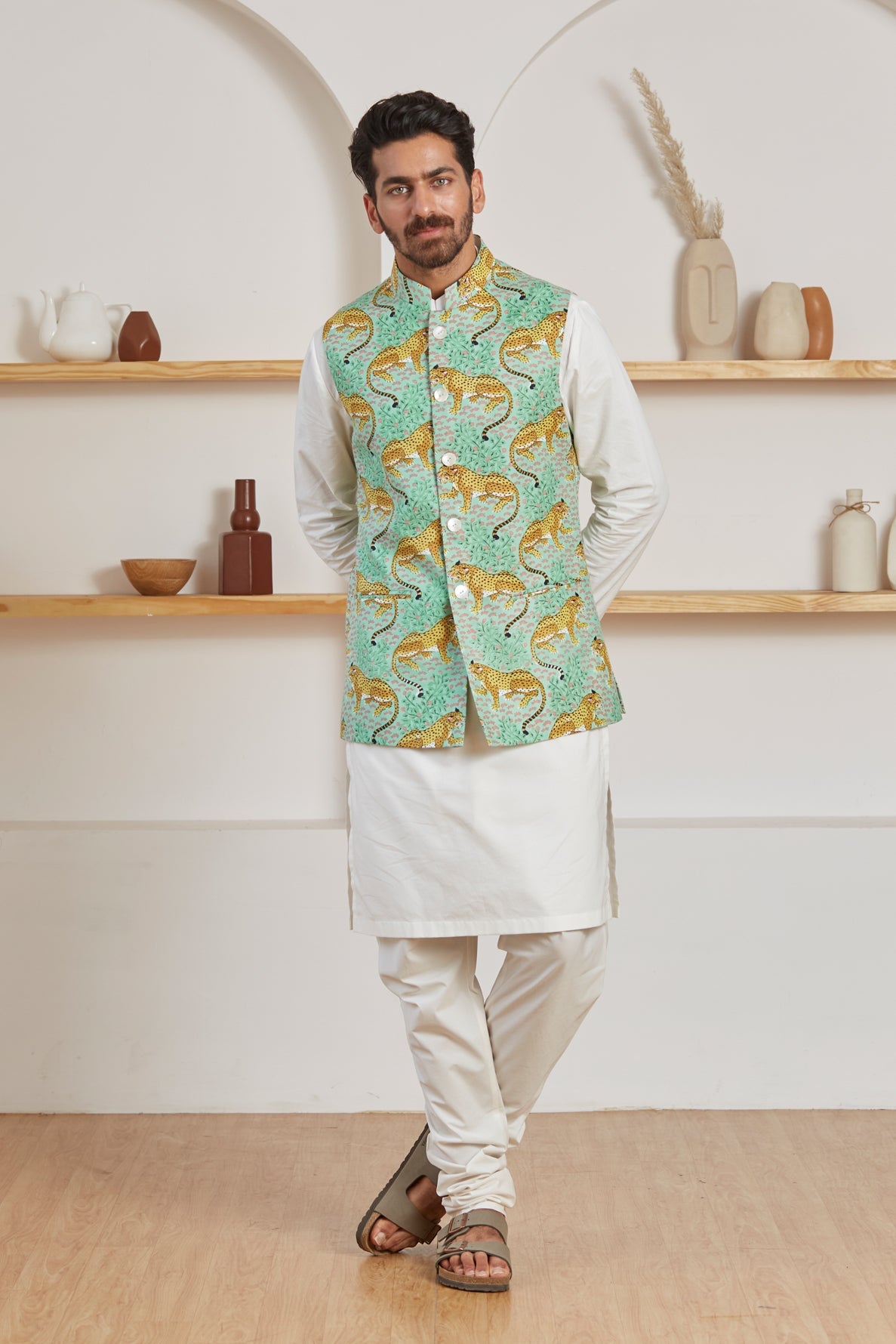 Look the best version of you in this cool and tranquil green Nehru Jacket. The beauty of lightweight cotton we use is that comfort is always achievable. The soft colors are an attractive match for your serene personality, and the unobtrusive dotted pattern adds a hint of exquisite detail.