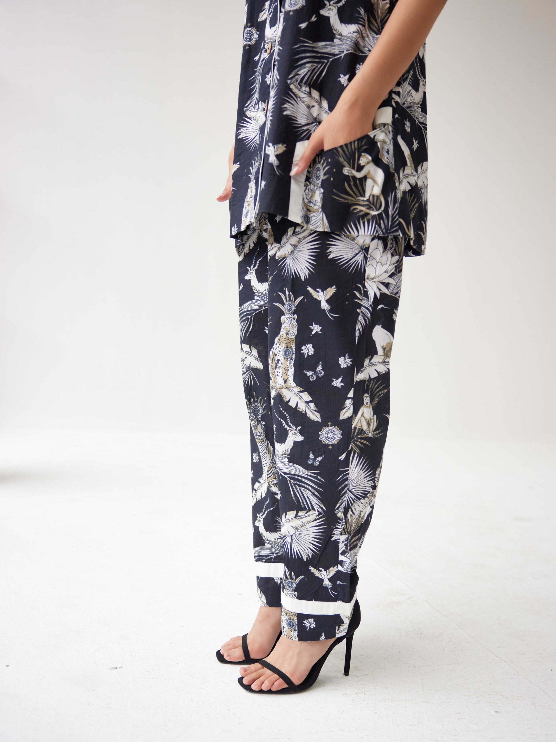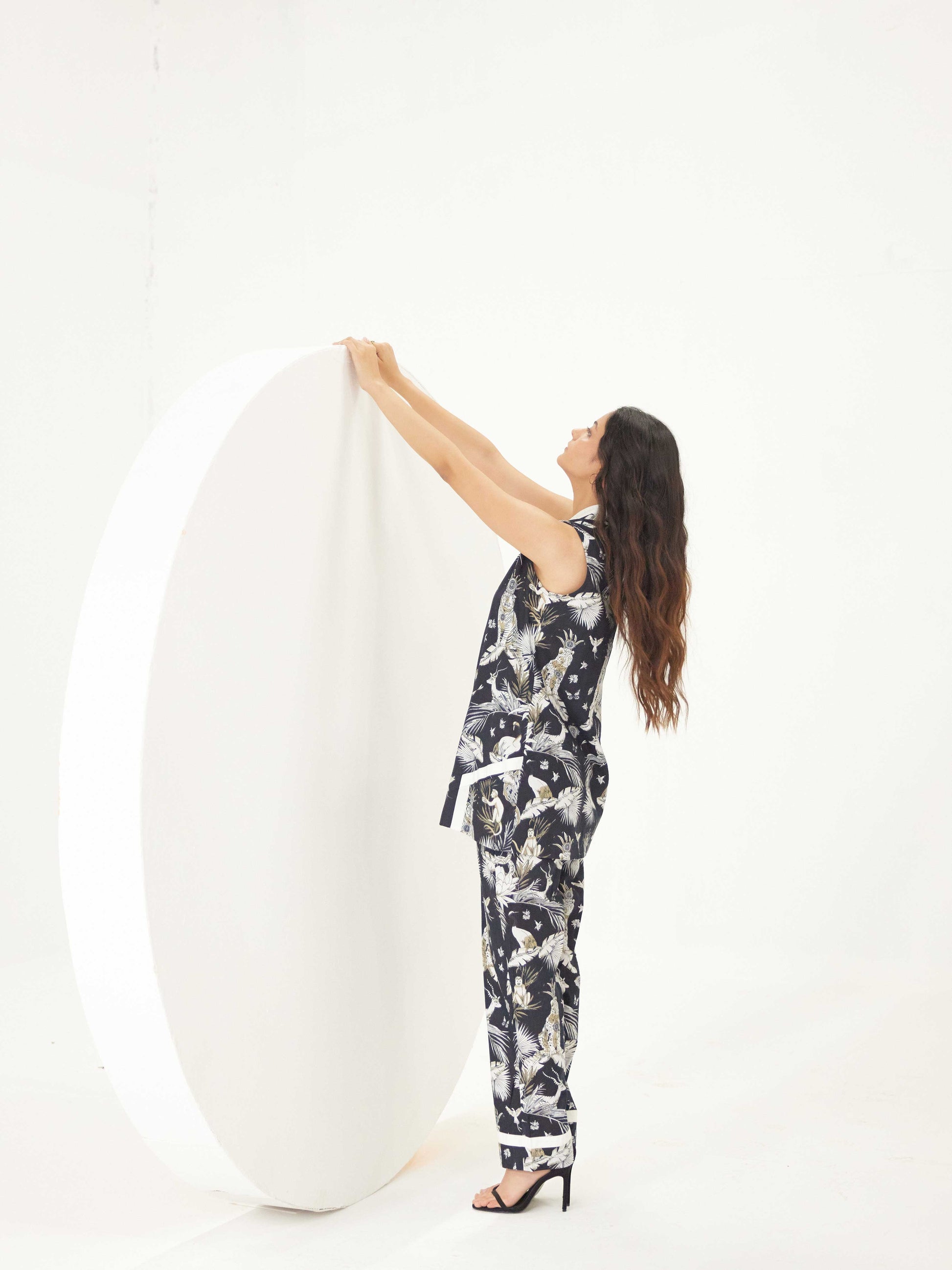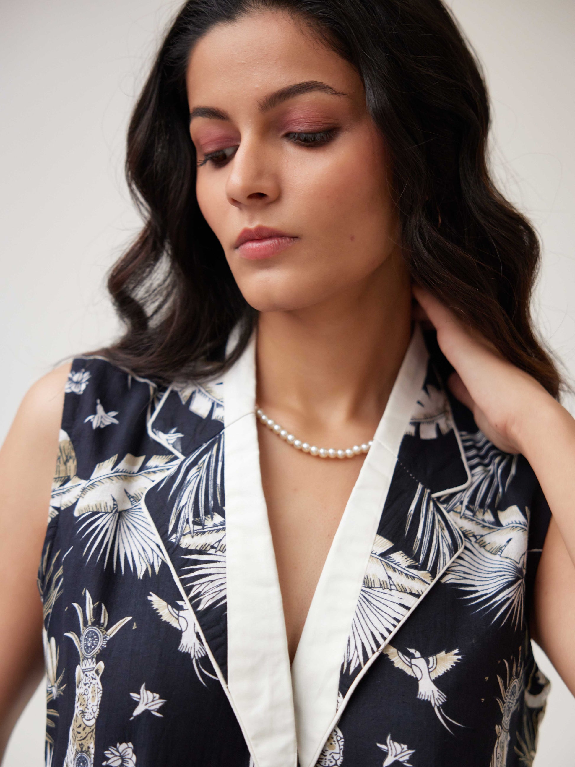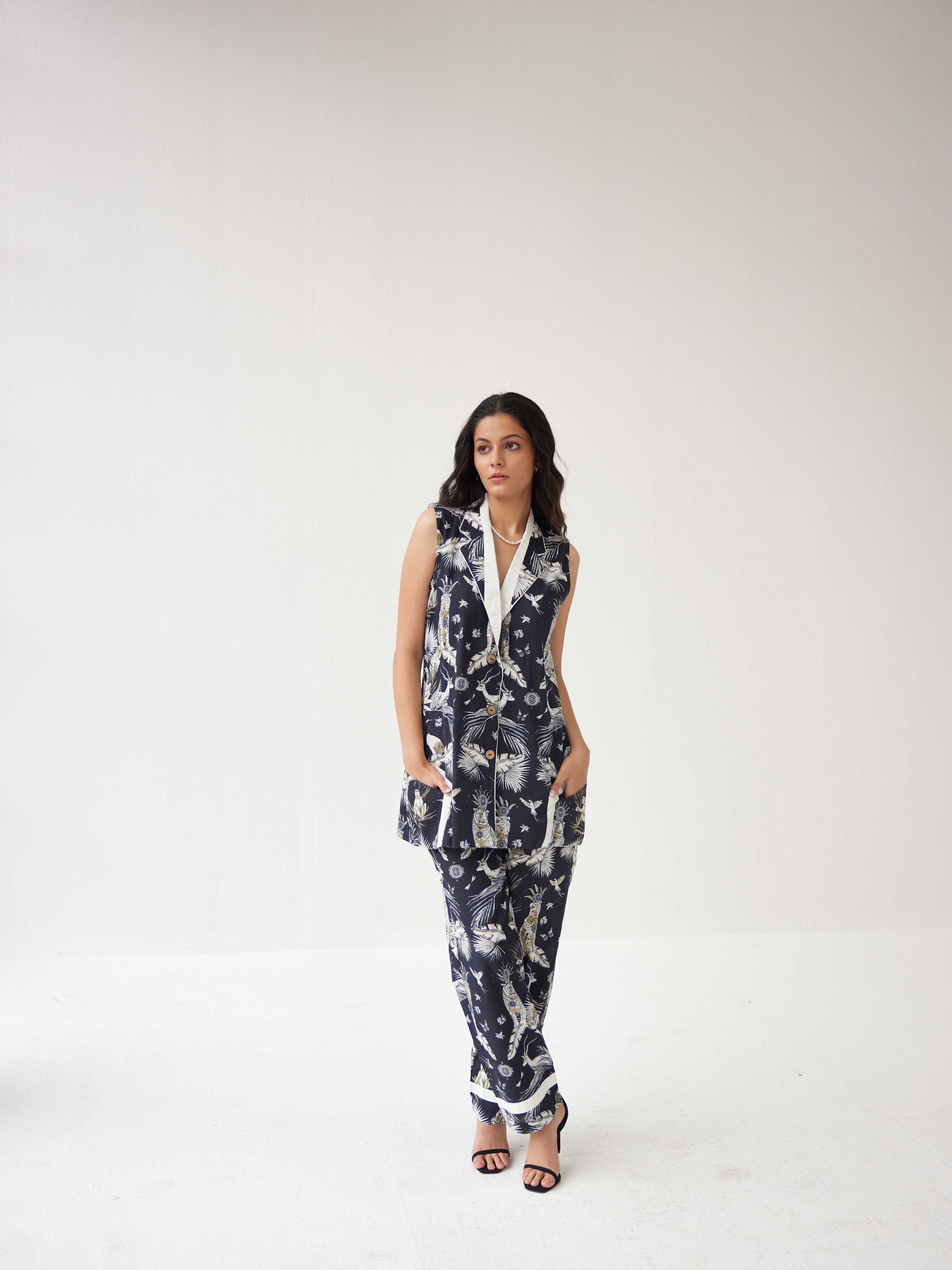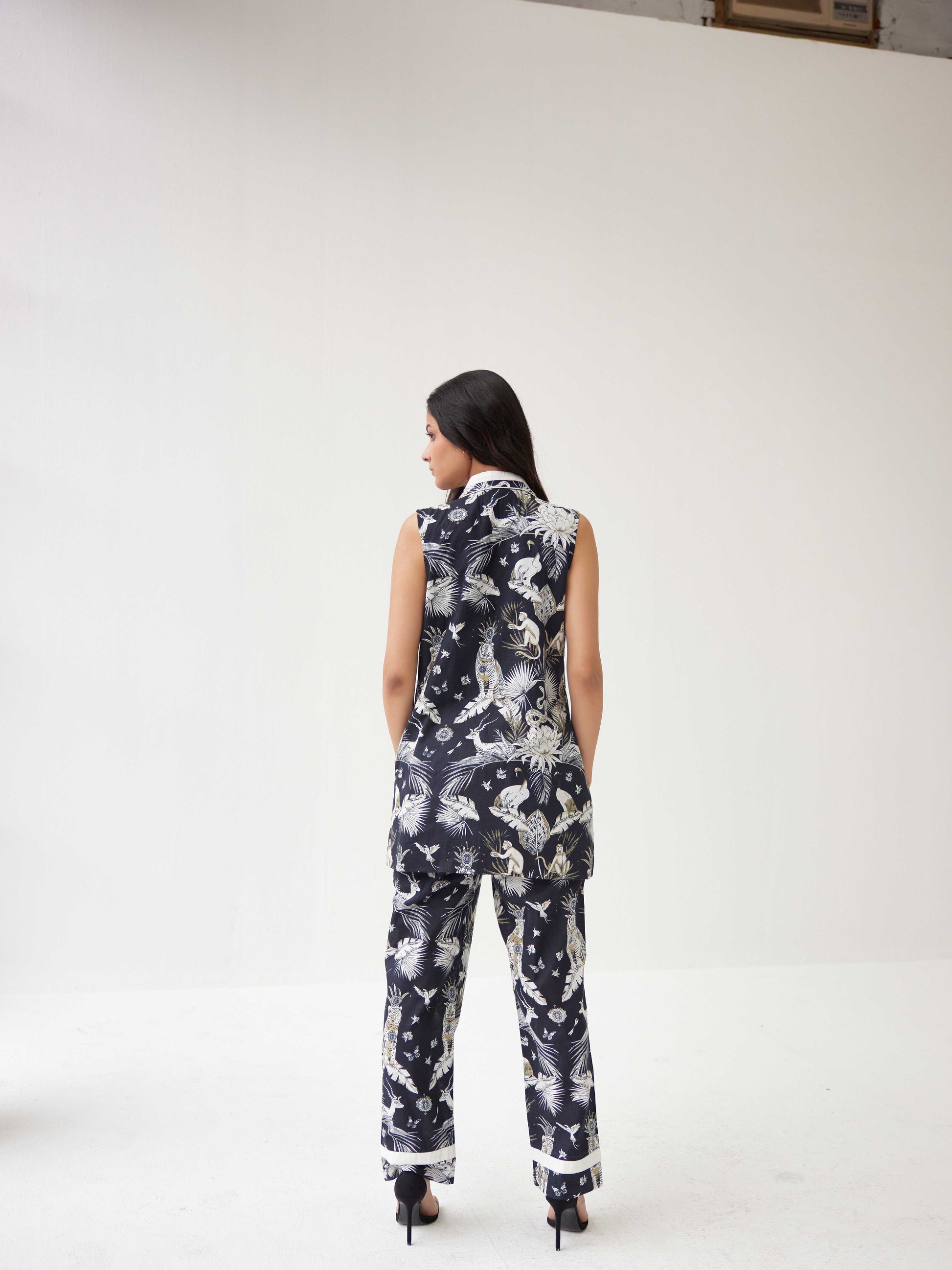 Elevate your style with our RELAXED FIT Viscose Crepe Suit, showcasing a captivating black forest print. The white coat collar and cut sleeves add a touch of sophistication, complemented by a front button closure and front pocket with white patti detailing. Achieve a classic, standout look effortlessly. Shop now!