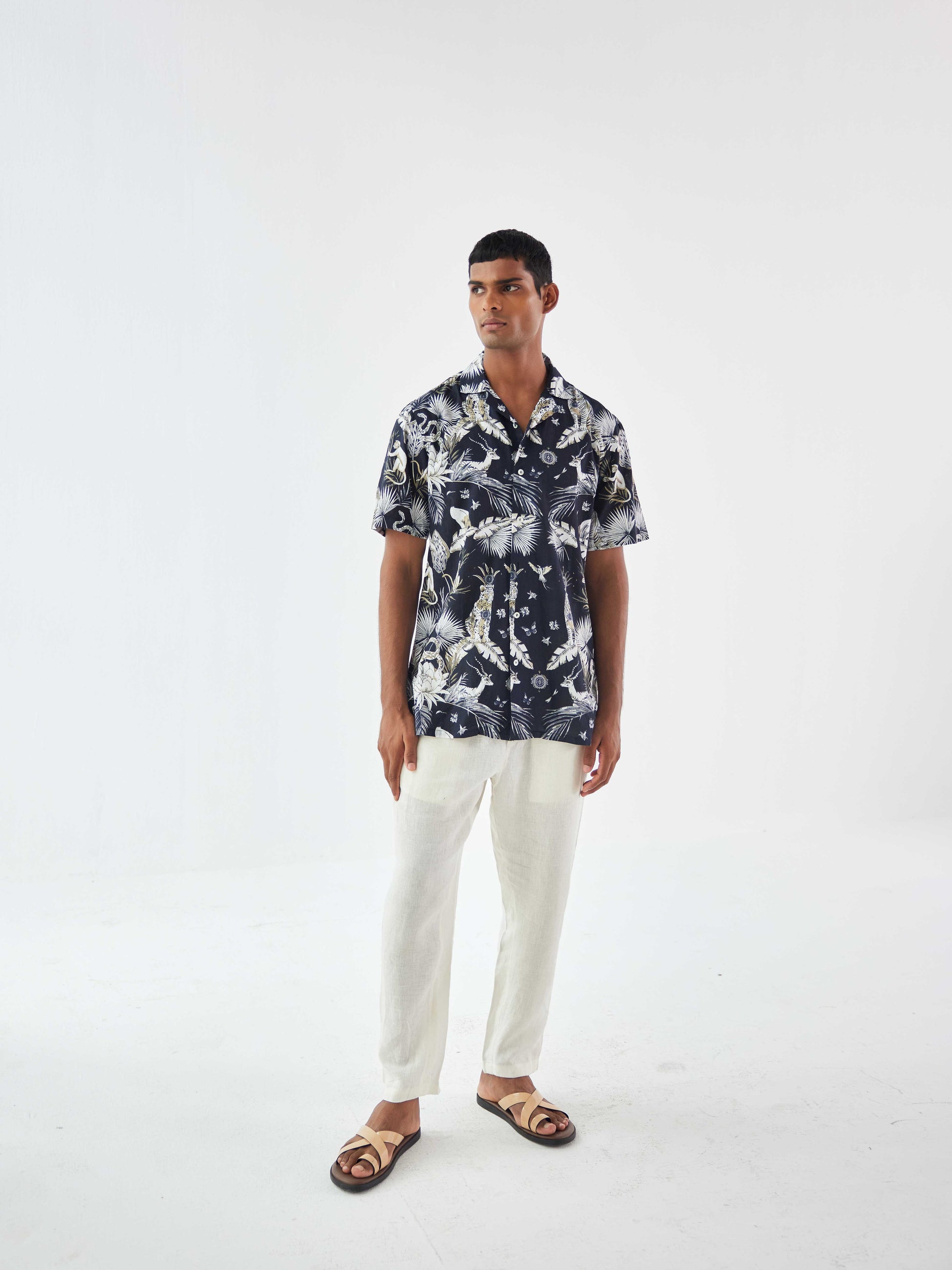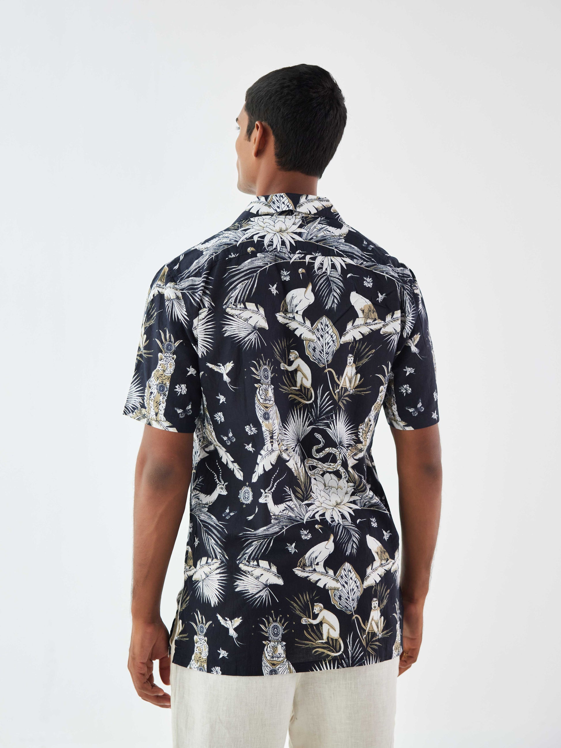 Step into the wild with our Black Printed Resort Shirt, crafted in pure cotton. Immerse yourself in a jungle-inspired print featuring forest tigers, exotic plants, and vibrant birds. The cool half sleeves make it perfect for vacation wear, combining comfort and style effortlessly. Unleash your adventurous spirit with this unique and captivating addition to your wardrobe.