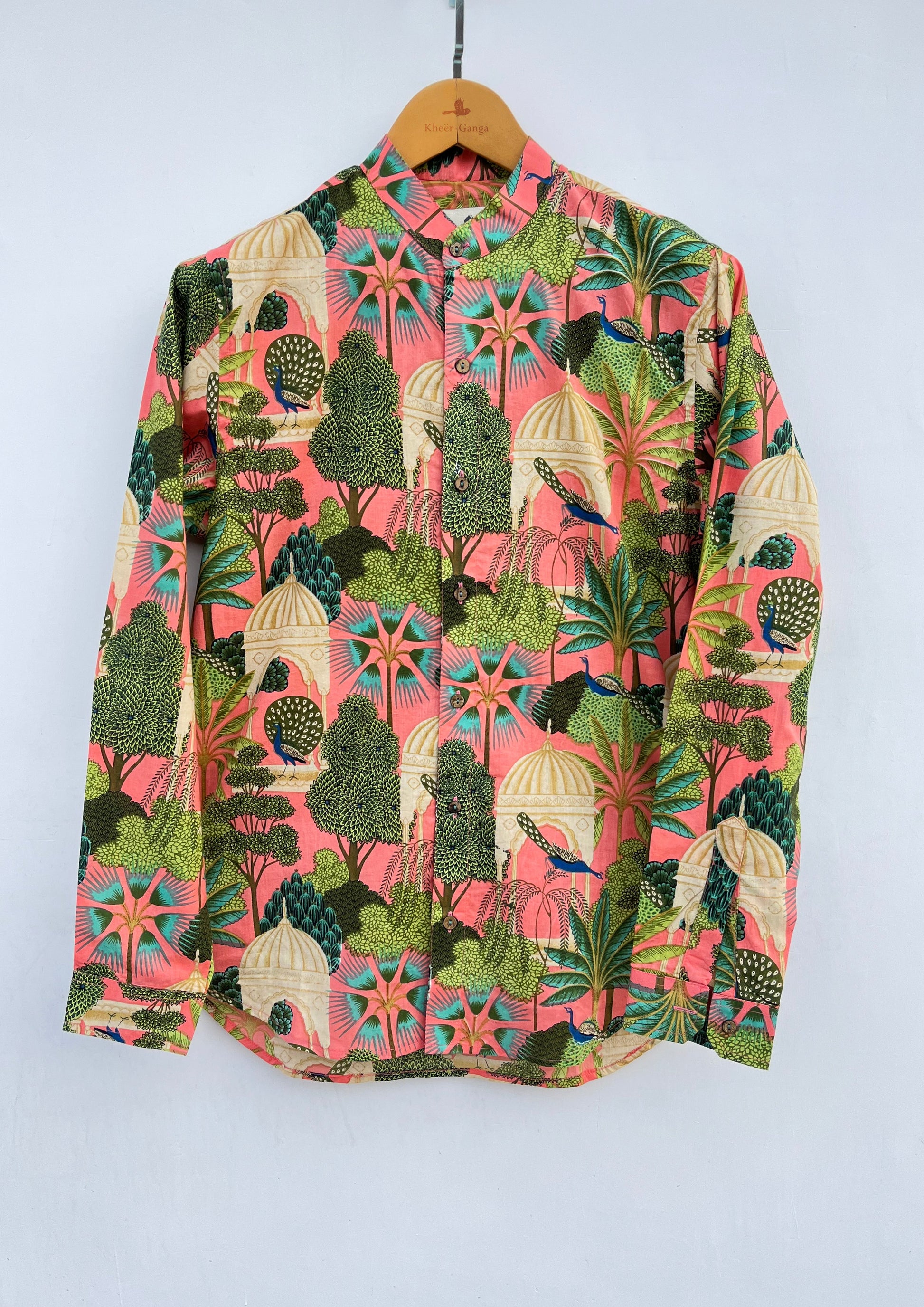Put your vibrance on display in this groovy pink mughal garden Shirt. Breezy, lightweight cotton lets you have the age-old traditional comfort. The pink is an attractive match for your liveliness, and the impeccable traditional pattern adds a hint of exquisite detail.