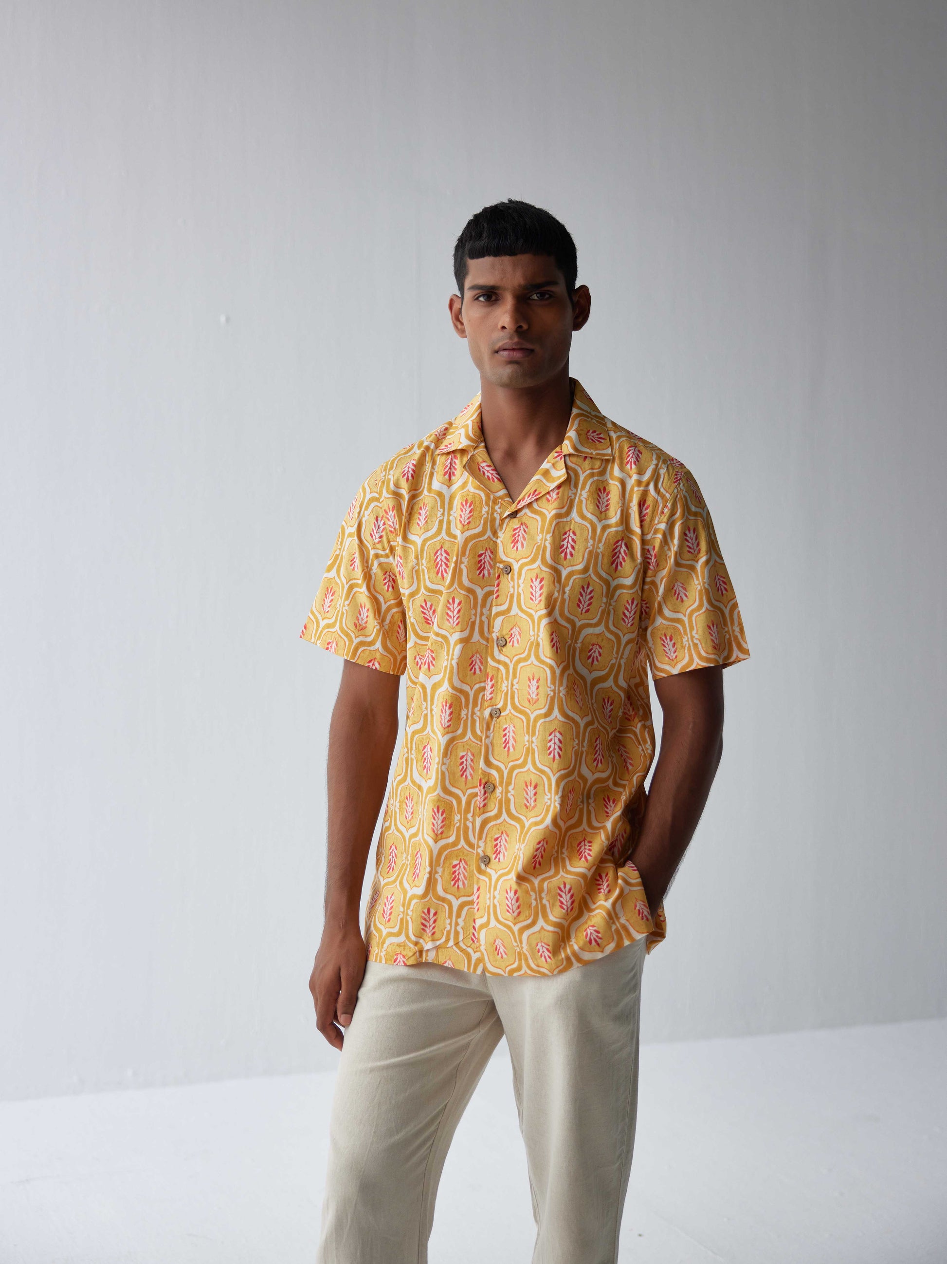 Step into style with our Half Sleeve Pure Cotton Printed Resort Shirt featuring a vibrant yellow block print. Crafted for comfort and designed for flair, this shirt is the perfect blend of fashion and ease. Elevate your resort wear with this statement piece that seamlessly combines breathable cotton with a touch of bold sophistication.