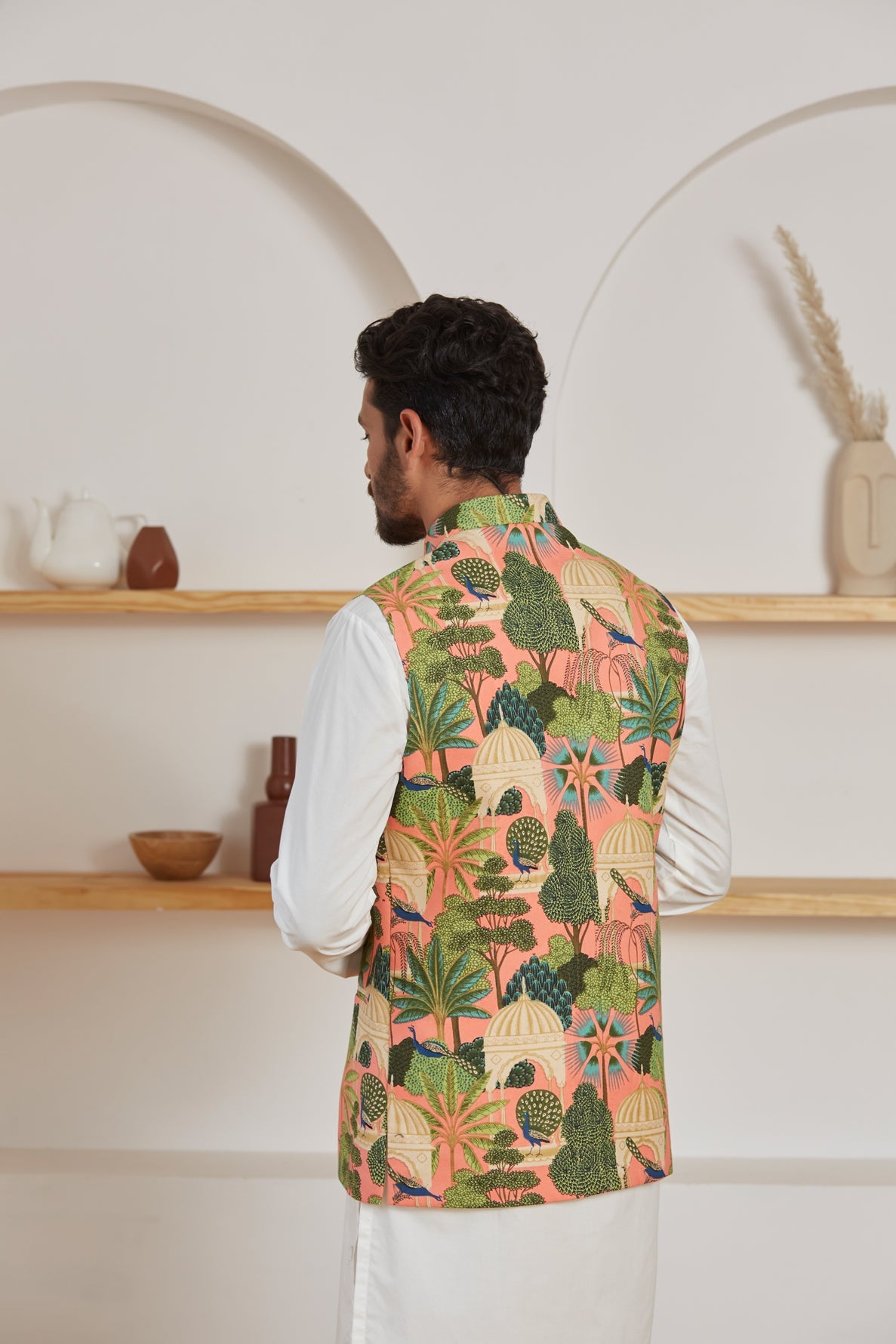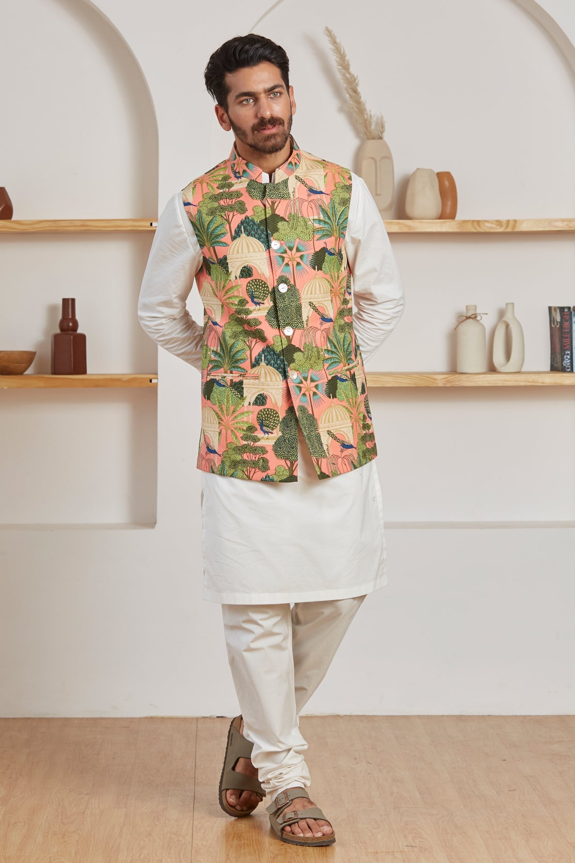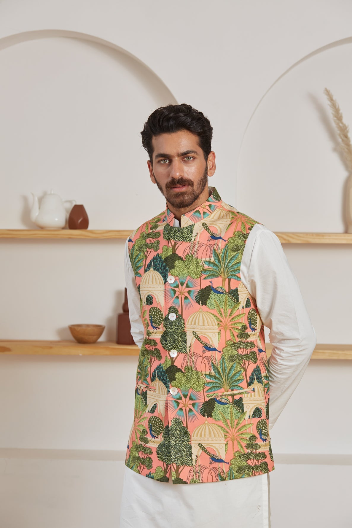 Be the most noticeable person in the room in this serene dusty rose printed Nehru Jacket. Let the light, organic cotton keep you in incredible comfort all day long. The soft colors are an attractive match for your tranquil personality, and the modest dotted pattern adds a hint of exquisite detail.