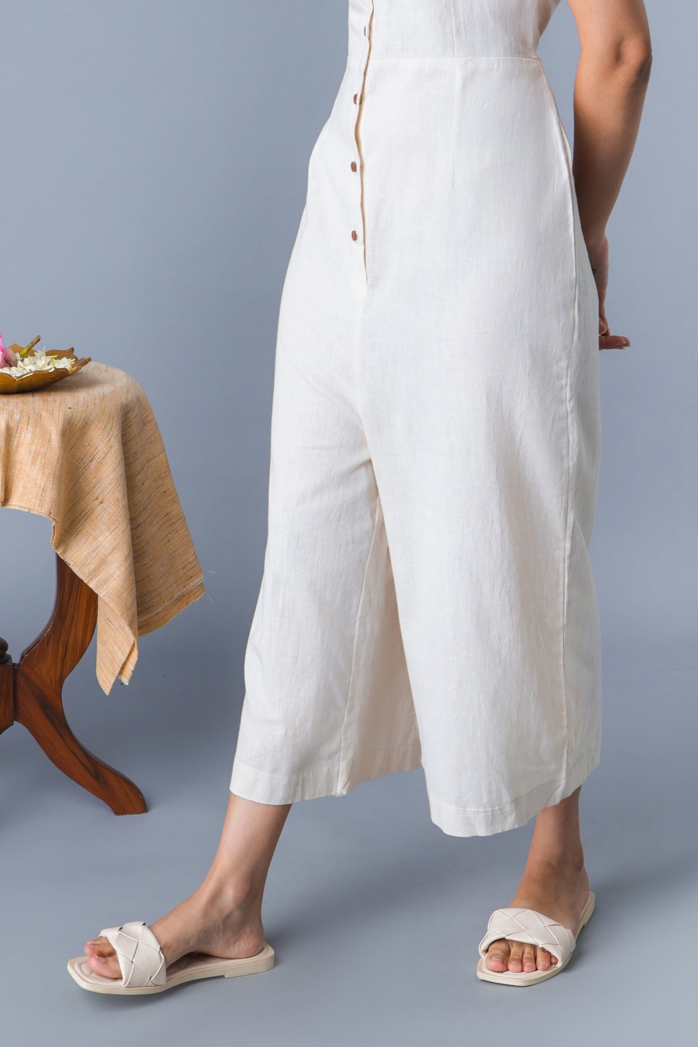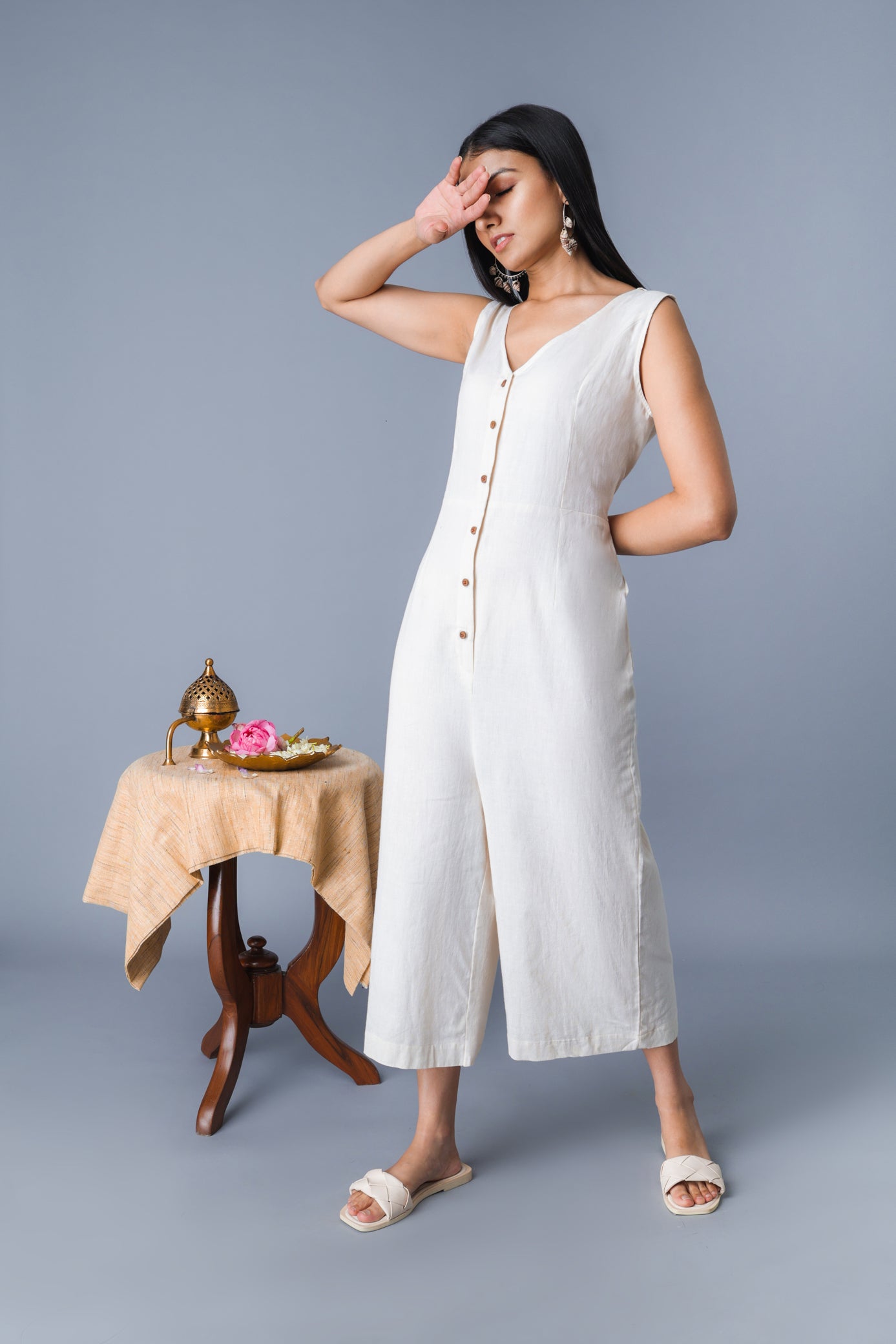 A stylish blend of cultures for the modern, outgoing Indian woman, this white summery cotton jumpsuit will keep you relaxed as you gracefully navigate through conversations over dinner. Your skin will love the soft, breathable fabric. Crafted with love, this jumpsuit is sure to become your go-to option for nights at the hotel and outings at your next vacation!