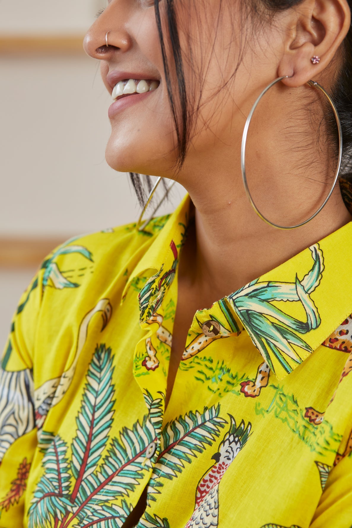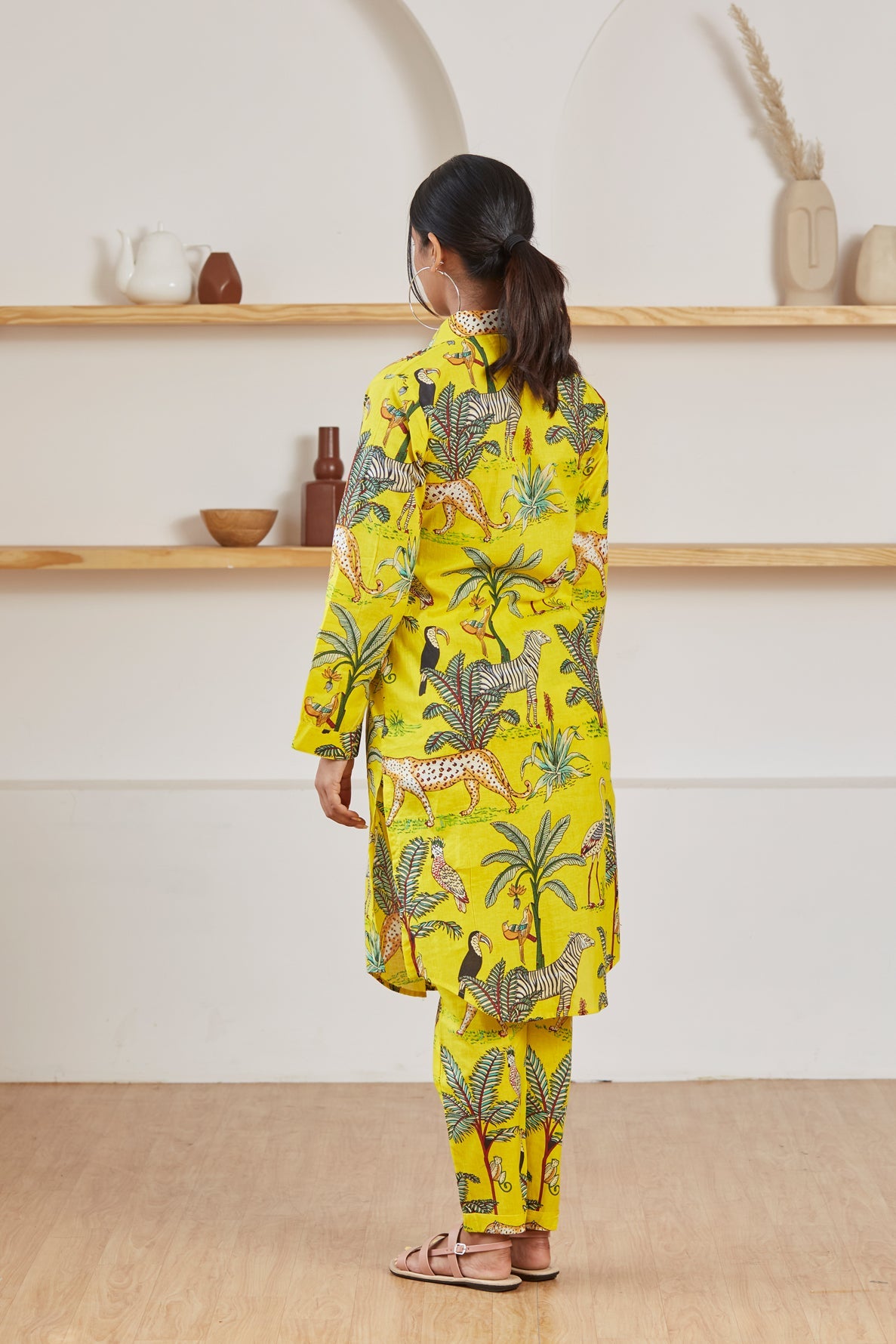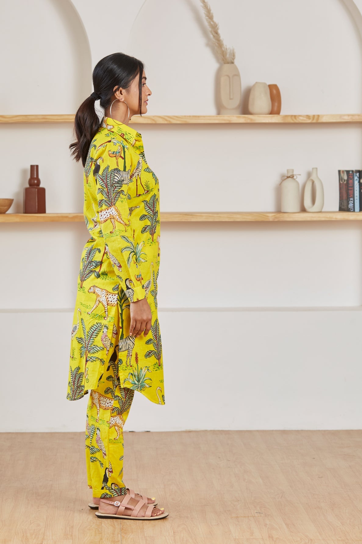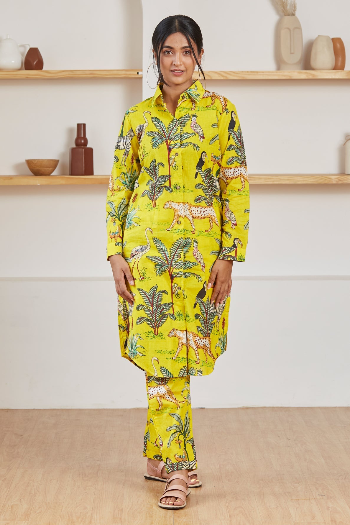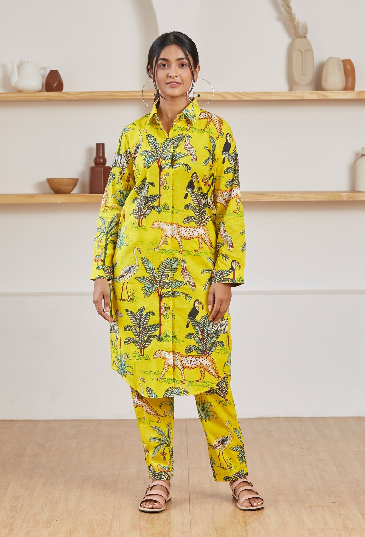 This is a lightweight and comfortable vanaspati printed top and pant set for summers. The top has long sleeves, front open buttons and side pockets. The pants are loose straight cut and have wide legs that sit at the ankle. Perfect for travels to relax your mind and body.
