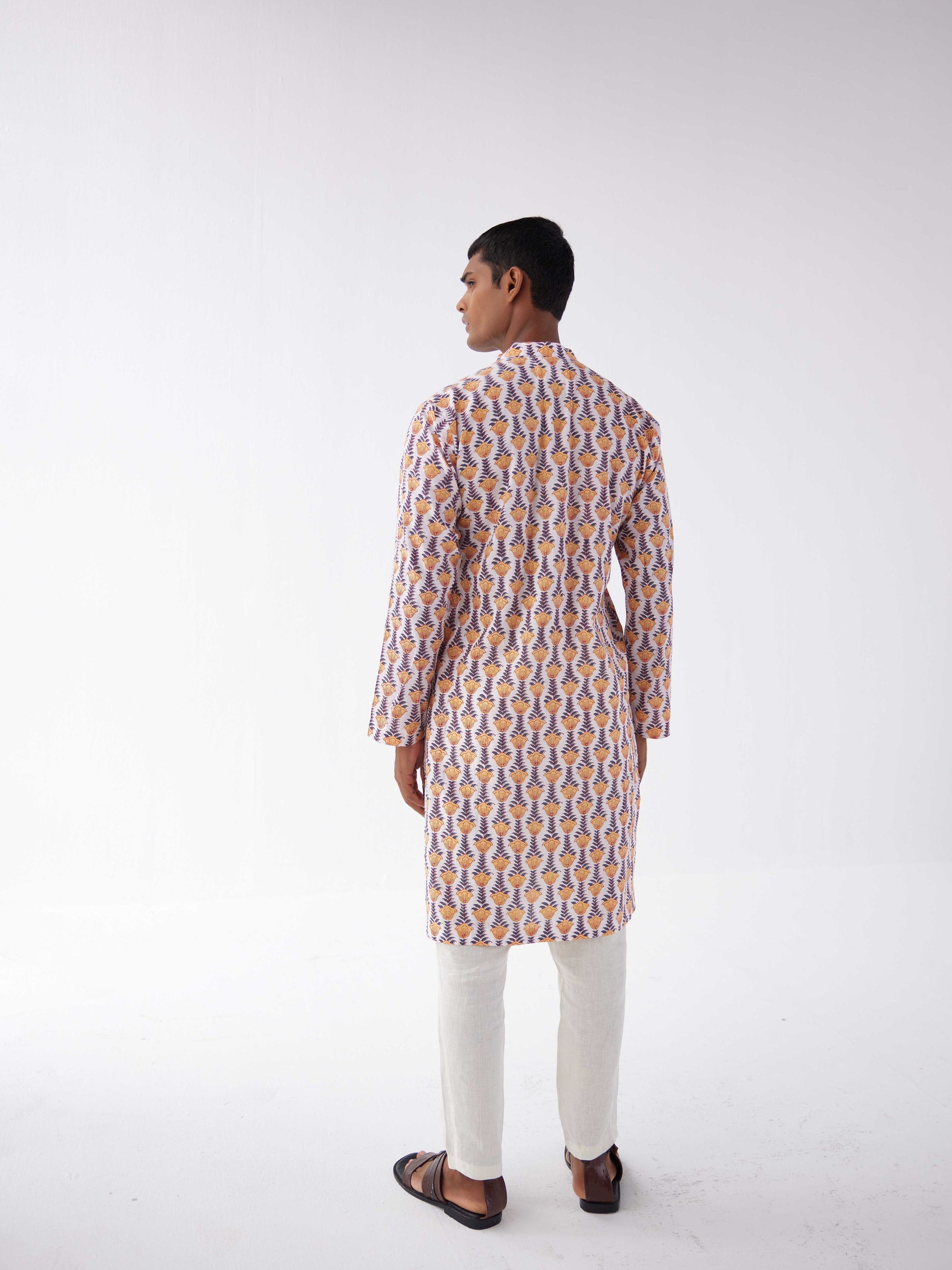 This Viscose Crepe kurta is the perfect addition to your wardrobe. It features a relaxed fit and a white design with printed tulips in yellow color on both the front and the back. The attractive Chinese collar completes the look.