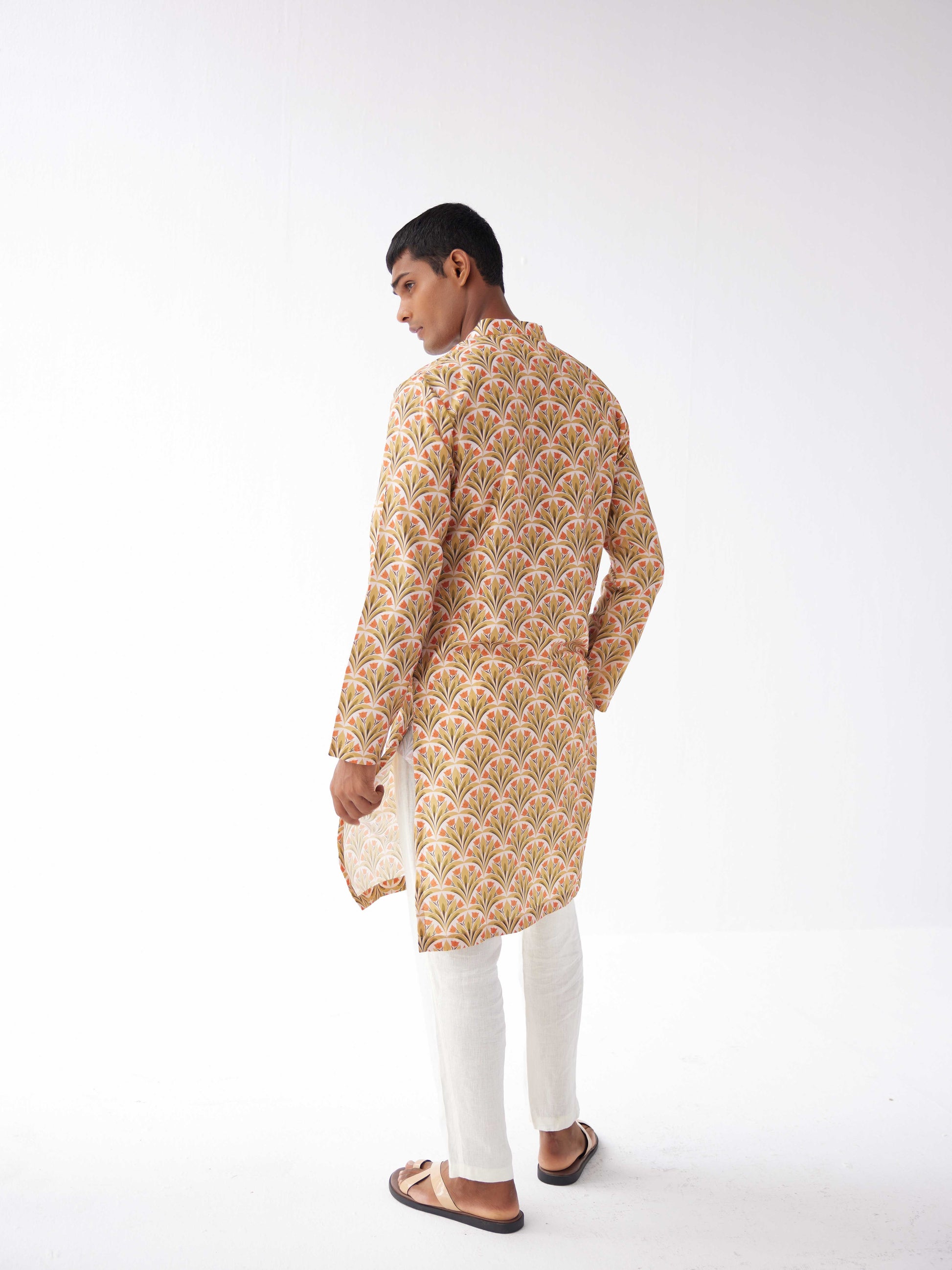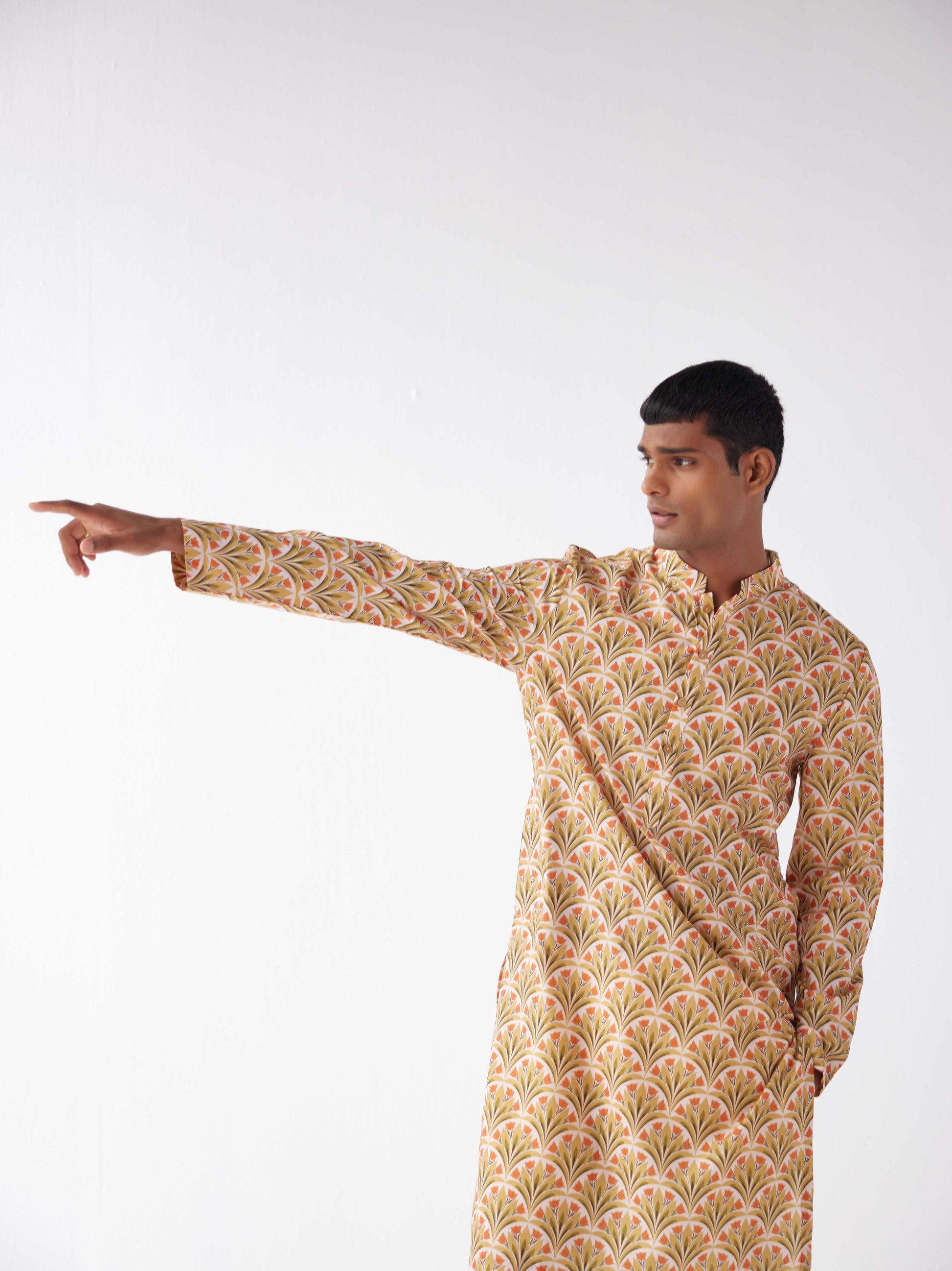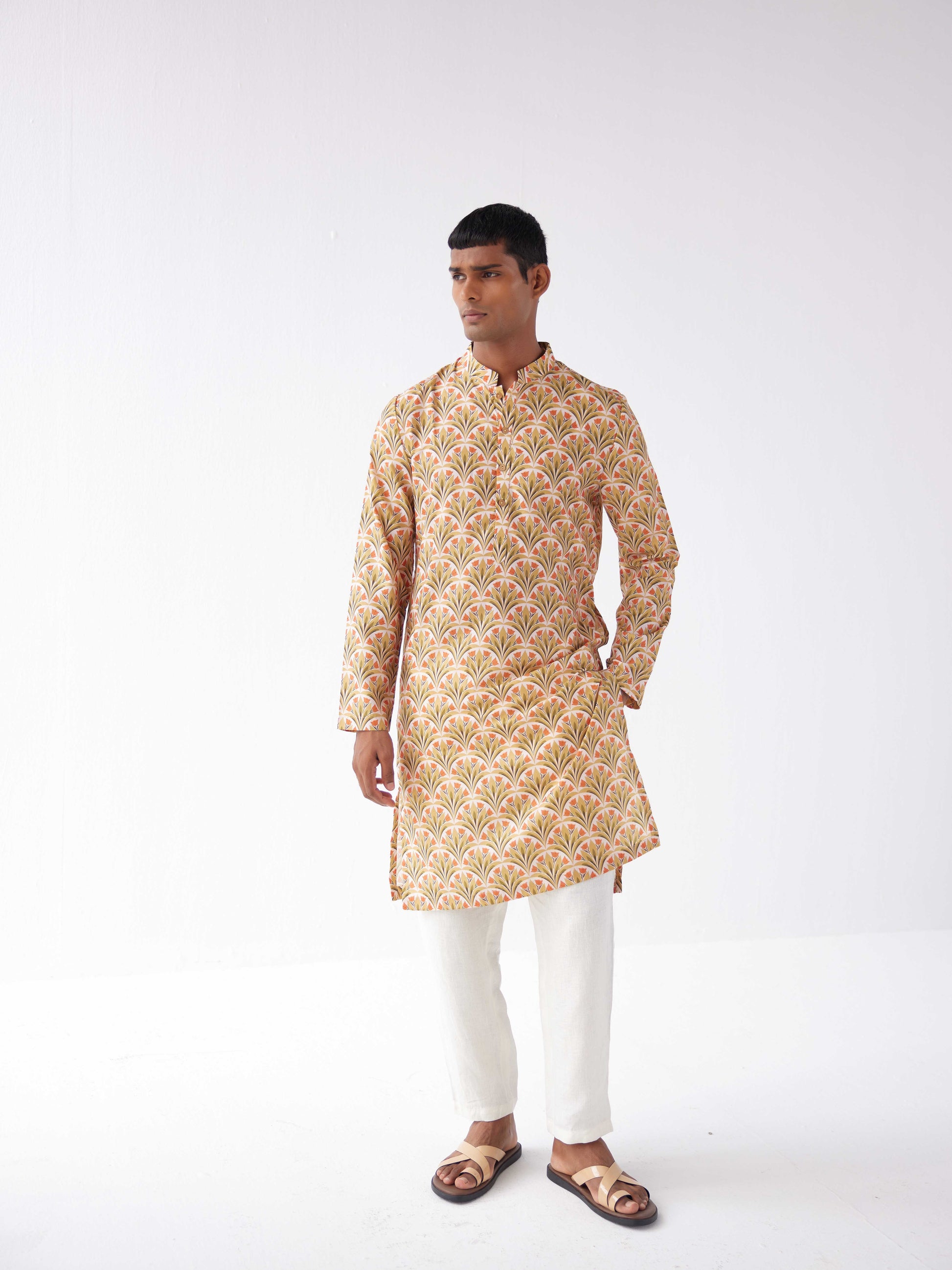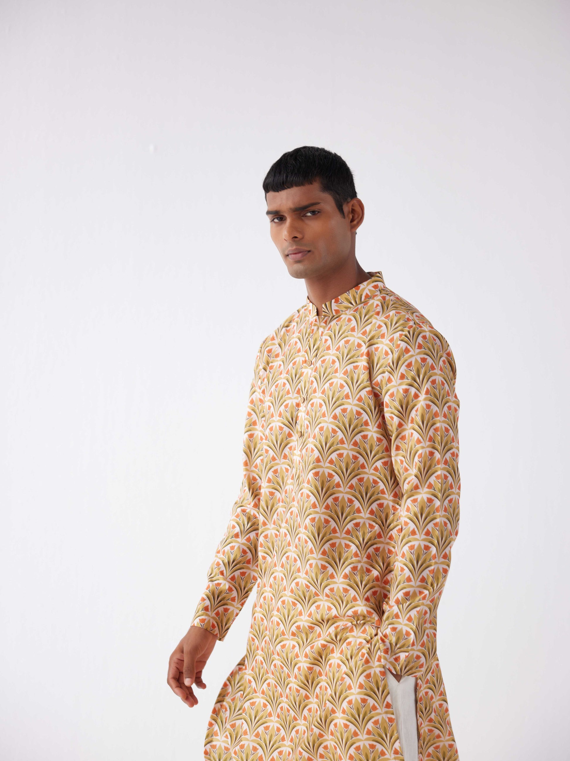 This elegant kurta features a relaxed fit in a beautiful yellow viscose crepe. The print features tiny flowers and grass prints for a unique and stylish look. Chinese collar is used for an extra touch of style. Be stylish and comfortable with this fashionable kurta.