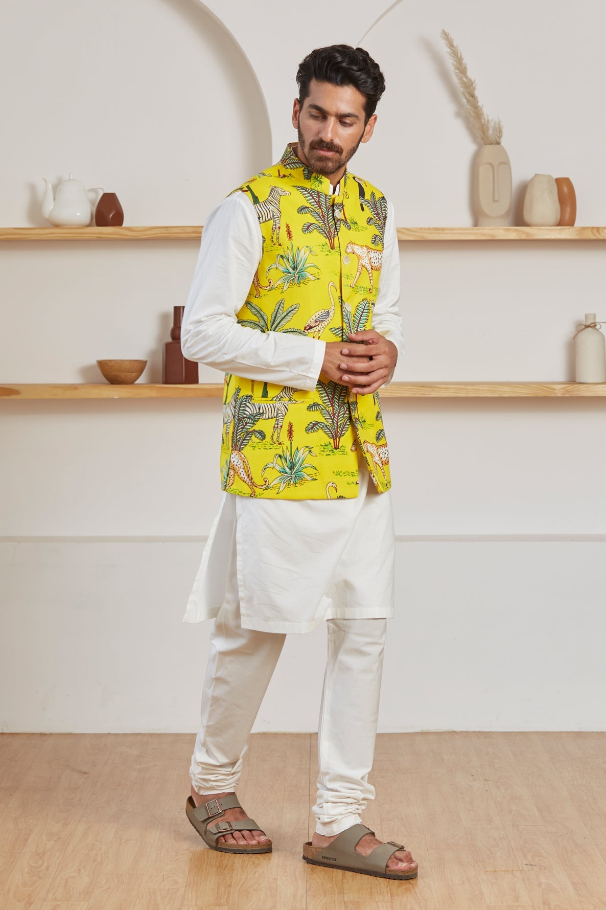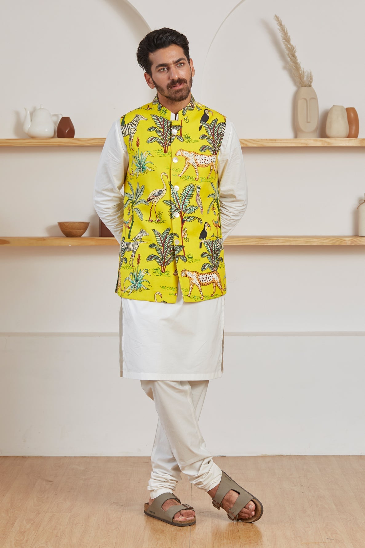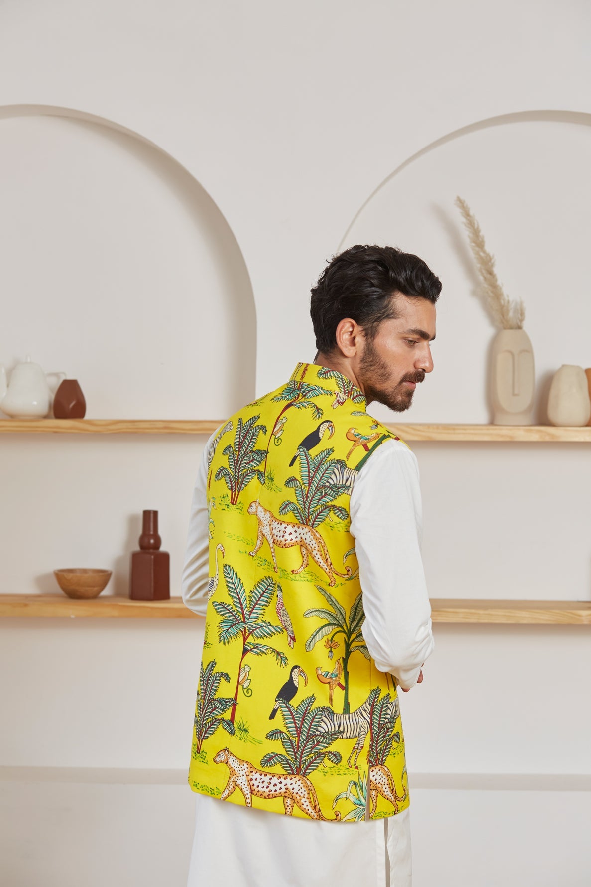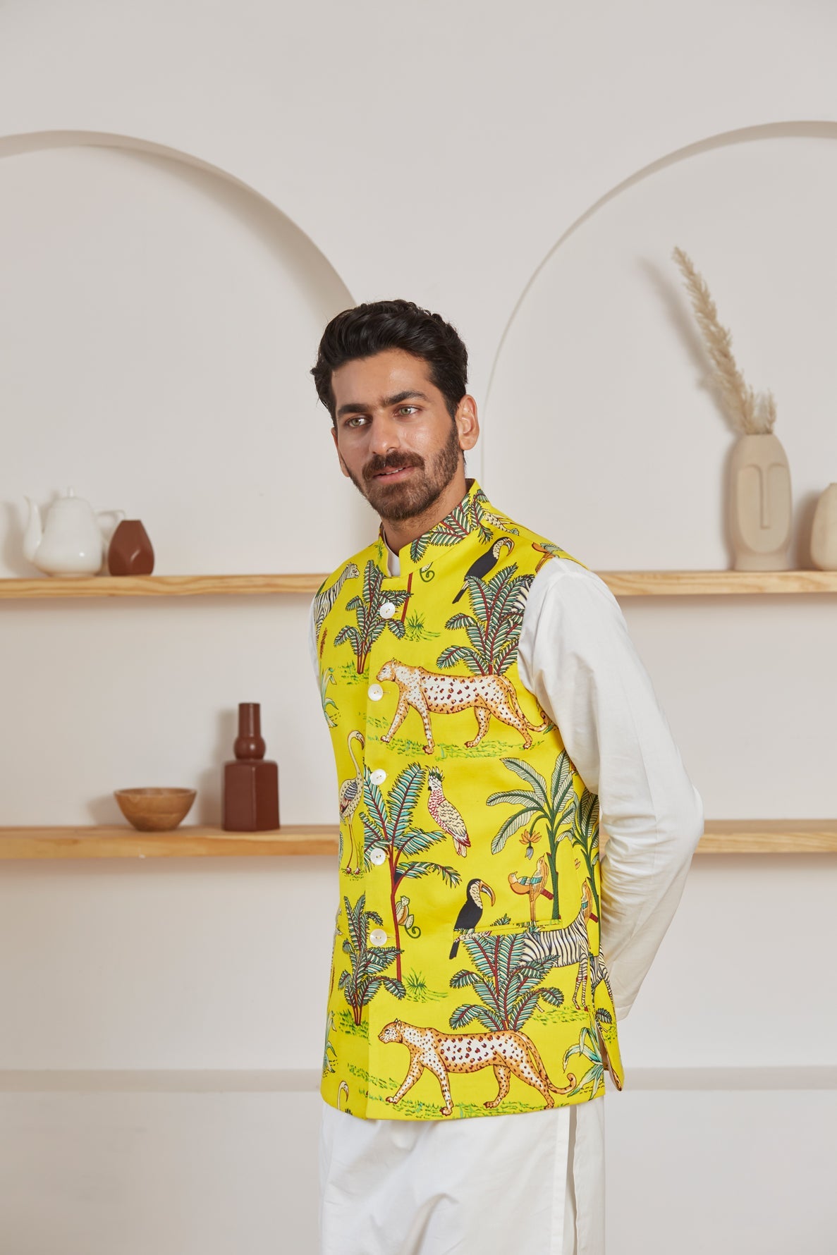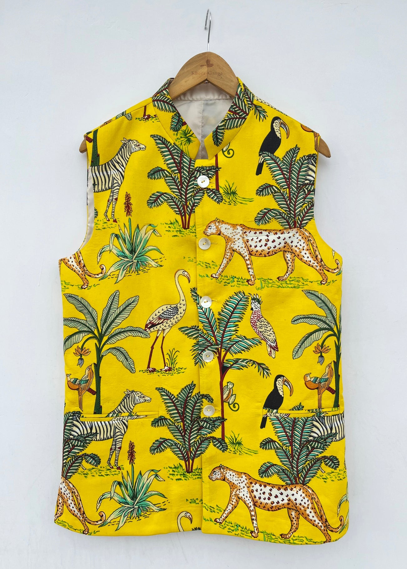 Be the coolest person in the room in this calm and breezy Mustard yellow Nehru Jacket. Let the light, organic cotton keep you in incredible comfort all day long. The vibrant colors are an attractive match for your tranquil personality.
